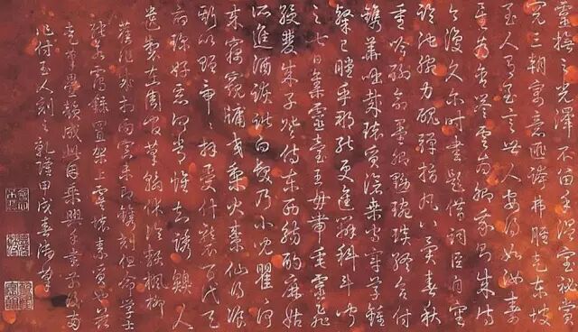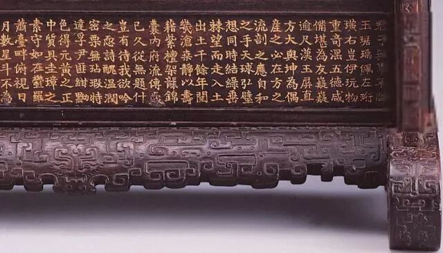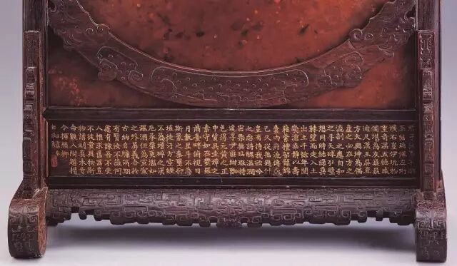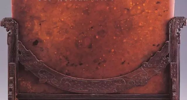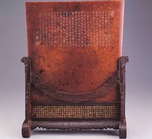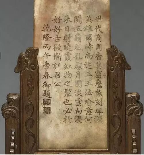 玉版玉质的摩氏硬度为6.5,光泽温润,颜色则赭红带黄绿,并有大大小小的斑点,有如天际星云银河。其外形非正方,而是呈梯形,上下缘均涂有深褐色颜料以掩饰新切口的痕迹,厚度则由中段向左右两侧缓降,推测此玉版原为新石器时代大形玉刀的半成品,流传至清乾隆时,经宫廷作坊重新修整、配座而成屏风。编号为「吕」字号,表示曾陈设于养心殿。玉版原为光素,清高宗时加琢御制诗二首。由诗看来,高宗认为此玉版「嶷嶷逾尺」、「阅几沧桑」、「色得元黄之正」、「质具圭璋之素」,其堂皇、长远、正统、礼制的特质,完全符合帝王彰显皇权所需的象征意义。一度自信如乾隆皇帝者,面对这件稀珍瑰宝也曾「自审临池腕力丑」,因「虞坏其质」而未将十一年春所写的诗刻于器表,仅是嘱咐学士张若霭代为书镌于紫檀木架上,可见对此收藏的万般宝爱。不过八年后,即乾隆十九年(1754),高宗又为之作诗咏赞,且乘兴亲自书写前后二诗交予玉匠镌刻,玉版遂不复素净的原貌。