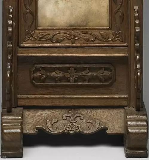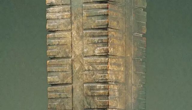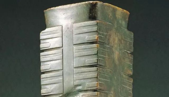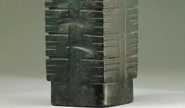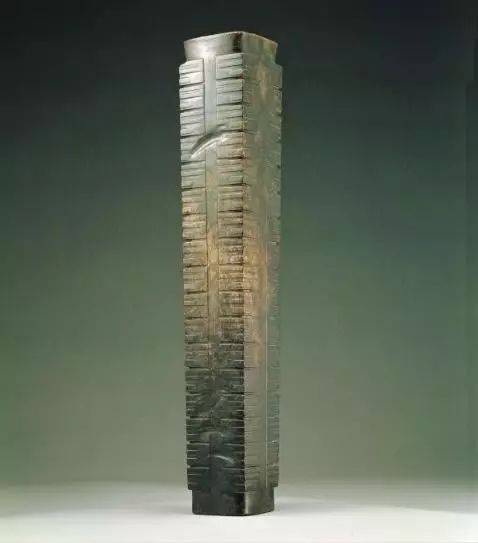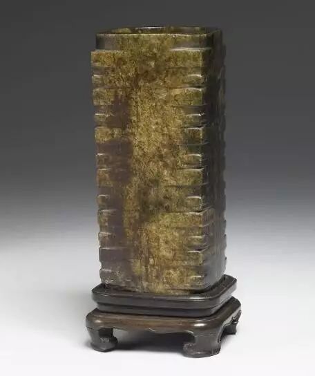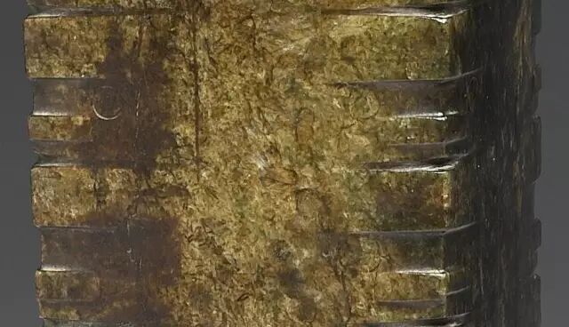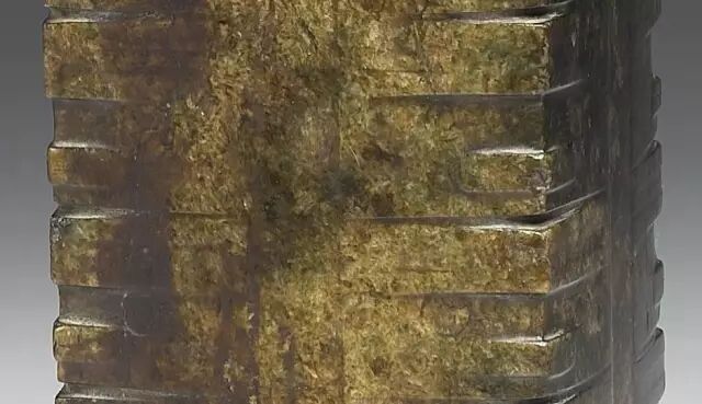 距今约四、五千年前,在长江下游的太湖流域,发展了良渚文化。玉琮正是良渚居民用以祭祀神祇祖先的重要礼器。良渚玉琮的基本造形为略呈上大下小的方柱体,有上下贯穿的大圆孔;外壁以四个转角线为中心,上下垂直堆栈地雕琢「面纹」。这件深浅交杂的褐色玉琮,是典型的良渚文化晚期玉琮;外壁分为六节,每节以转角线为中心各琢一小眼面纹,全器共有二十四个面纹。每个面纹以刻有并行线的长横棱象征神祖所戴的「羽冠」;以同心双圈刻绘出眼睛,还刻有代表眼角的短线;象征鼻子的短横棱上,则刻绘两端方转的单线。因为年代久远,这些刻纹都已模糊。