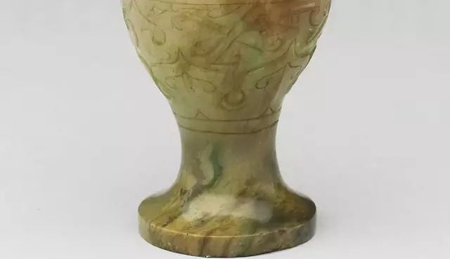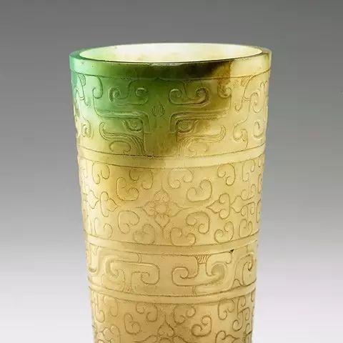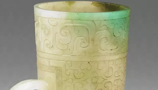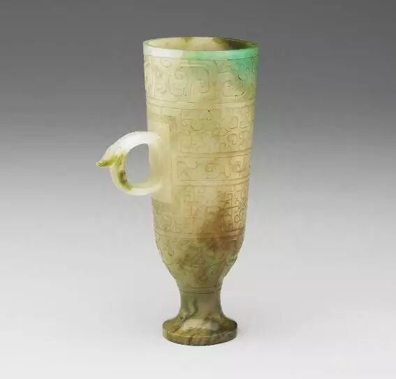这件美丽秀雅的玉杯,是以莹润半透明的青白色玉雕成。杯体略呈细长的圆锥体,有高足与单柄。自口缘至高足上,以五条横饰带围绕器表,饰带中浅浮雕各式云纹、四瓣叶纹。口缘处、柄之外侧、高足至器腹下端,都因接触铜锈而沁成蓝绿色。其中以口缘处的沁色较为偏蓝,这或是因所接触的铜器,是用蓝铜矿中提炼出铜来铸造之故。古人相信美玉富含「精气」,更相信物质会产生感应作用。汉代的贵族特别重视玉制的容器,他们希望玉的精气能渗入所盛装的水或酒中,令饮者能成仙得道。﹝史记汉武帝本纪﹞记载,元鼎二年(公元前一一五年)时,汉武帝曾以铜盘玉杯承接露水,用以调和玉屑服食。近年来,曾于广州南越王墓曾出土成套的铜盘玉杯,应即是﹝史记﹞所记载,夜间承接露水之物。若与南越王墓出土的玉杯相比,故宫博物院的玉杯多了一个造形似英文字母a的单柄,这种单柄也常见于汉代的玉卮之上。
