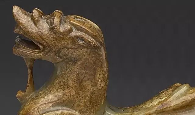 「螭」是龙的一种,几分像虎。此件玉觿器面微泛褐红,是传世器特有的「盘红」色泽,刻做成转首侧身形态,头与躯体的衔接方式与本院藏的龙、凤玉觿同,乃是战国时代玉匠处理此类动物玉雕的一惯作法。