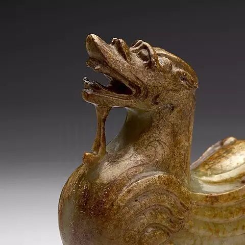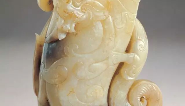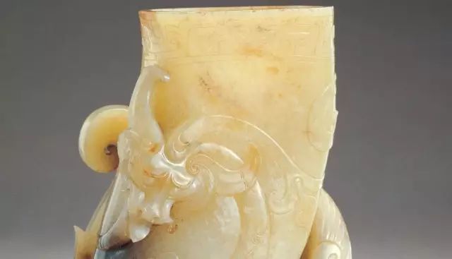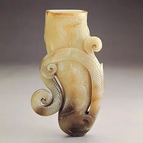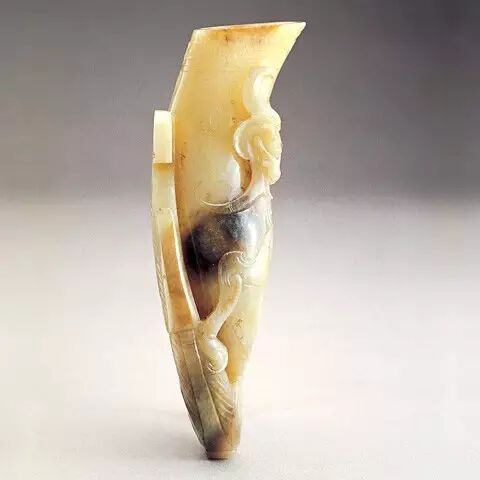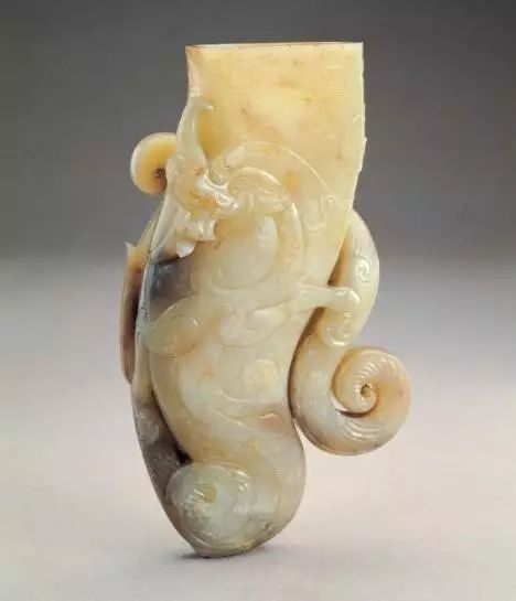青白玉质,全器作角杯形,器表浮雕一龙蟠绕,龙体矫健有力地凸显汉代工艺品特有的雄浑气势。此型角杯作为饮器,来自中亚,是汉代与中亚文化交流下的产物。