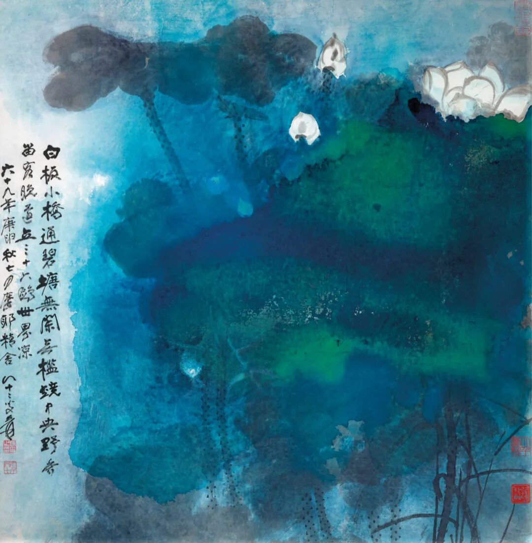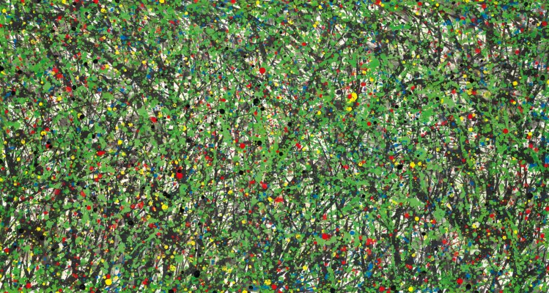 《春信》为吴冠中抽象风格中巅峰时期的作品,由明亮的绿、蓝、红、黄谱写出一幅动人的视觉交响乐。画家以不同深浅与粗细有别的线条及色点,交织出层次分明的空间形象。画面中,看似随意的斑斓色点及笔触,标志着春意盎然、百花盛开的景色。每一处细微的构图都可被视为更宏大设计的一部分。因此,看似混乱的笔触及散布的色点,这些表征特性都证明了画家非凡的创造力与精湛的绘画技艺。