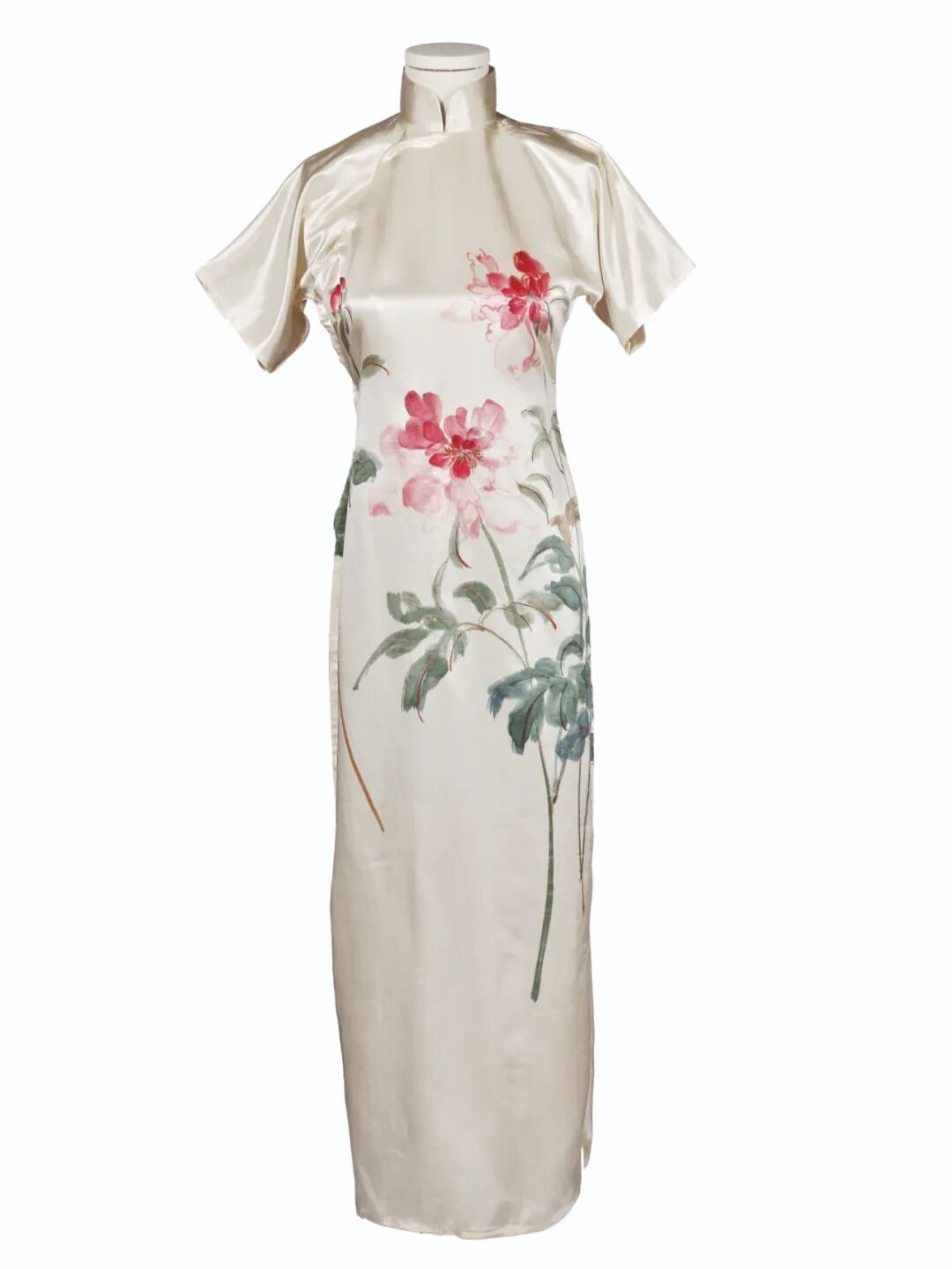 1949年春,张大千应殷商蔡克庭之邀从香港前往澳门作客。蔡家是濠江望族,宅邸位于澳门邮政总局后的大堂街,当时许多居住在澳门的艺术家常为其座上客。张大千将两只长臂白猿养在花园中,常在画室挥毫作画,闲时亦亲自下厨川菜设宴,十分惬意。每日清晨,他与儿子葆罗牵猿到大三巴等地散步,一时传为佳话。旅居蔡家三个月期间,画家多次题赠作品予蔡氏家族,以答谢主人盛情款待。此件罕见的芍药白缎旗袍,即是为蔡家女眷精心绘制、为数不多的礼物之一。张大千先在白缎上作画,再请裁缝师傅量身制成。手绘旗袍由蔡氏家族后人宝藏至今,从未公开展示,实属难得可贵。