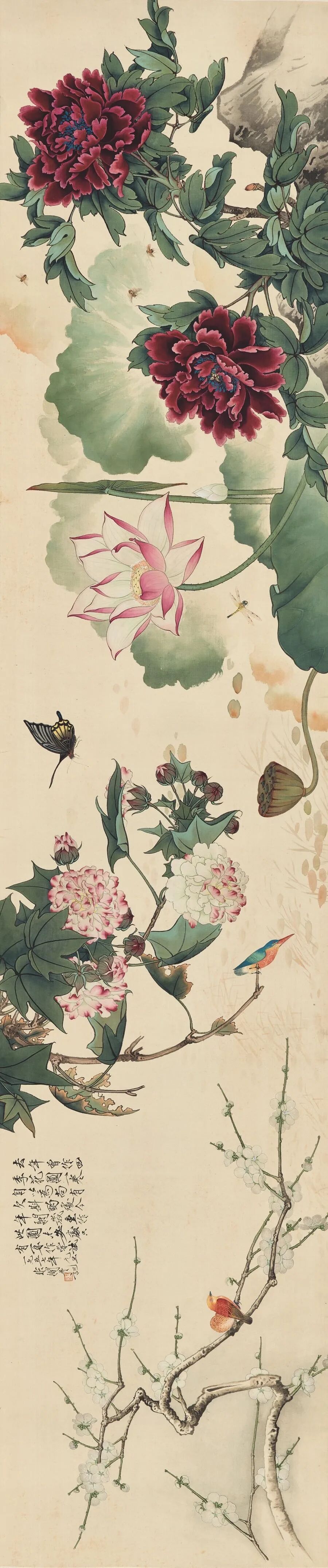 本幅绘四时花卉于一卷:阳春牡丹百千娇,蜂争粉蕊;入夏红荷亭亭立,蜻蜓款款飞;秋高芙蓉叶初凋,翠鸟蝶飞花;冬寒飘雪吹梅白,啼鸟一声换红装。本幅为于非闇作于1957年,是其少见花鸟长卷佳作。于非闇孜孜不倦地尝试与用心,于本幅题识清晰可见:去年之作 “尚有欠斟酌处”,今年重作,似乎仍有 “未安处”,留待下次尝试,可惜1956年卷已不知去处,此卷后是否有别有画卷,已不可知。