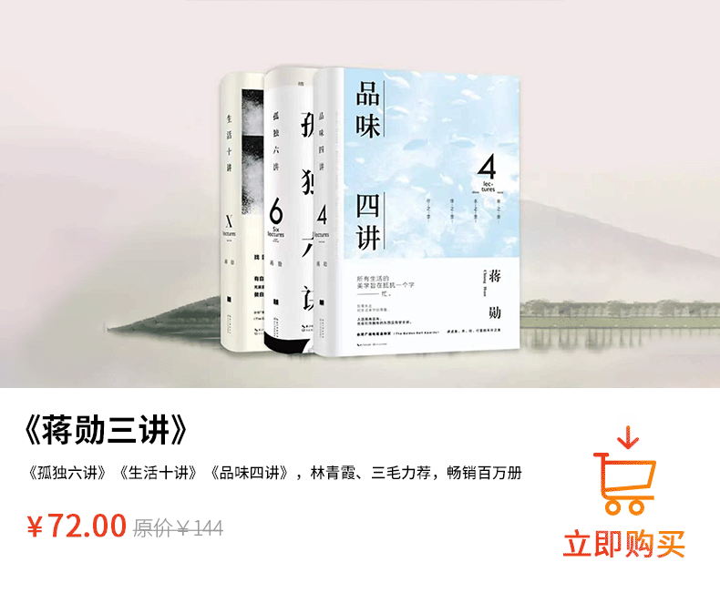 林青霞说:“蒋勋老师是我的偶像,听老师讲《红楼梦》,心里会产生安定的力量。” 她曾每周一次飞到台北,就为了听蒋勋讲述《红楼梦》。对于自己的定位,他说他愿“以布道者的心境传播对美的感动”。拥有了无数粉丝,也依旧坚守着内心的恬淡与从容,希望每个人皆能静下心来,好好感受眼前的世界,在烟火如常中寻到心灵的安宁。于是,用几十年的人生精研美学与生活的他,便把心中对美,对孤独,对生活的感悟,都凝结在了这套《蒋勋三讲》里。今天小编就为大家推荐这套《蒋勋三讲》,选择的是十周年纪念精装版本——蒋勋本人授权,经过十年人生沉淀后,重新作序、修订的典藏版本!共包含《孤独六讲》《生活十讲》《品味四讲》三本著作,是他的代表著作,也是华语世界销量100万+的畅销书。《孤独六讲》:破除人们对孤独的恐惧,带你认识孤独、正视孤独,在孤独中成长为更好的自己。《生活十讲》:重新定位生活。启发你用新的视角省思日常生活,在浮躁的现代生活,抽丝剥茧,找到内心的清明。《品味四讲》:讲透生活美学。从衣食住行着眼,让你发现,原来平凡的日子,也能成为“向往的生活”。写的都是日常生活点滴,思维视野却能涉及到个人成长、家庭社会、历史文化、心理等方方面面,文字洗练,饱含哲思,读起来直抵人心,通俗易懂又不乏深度。