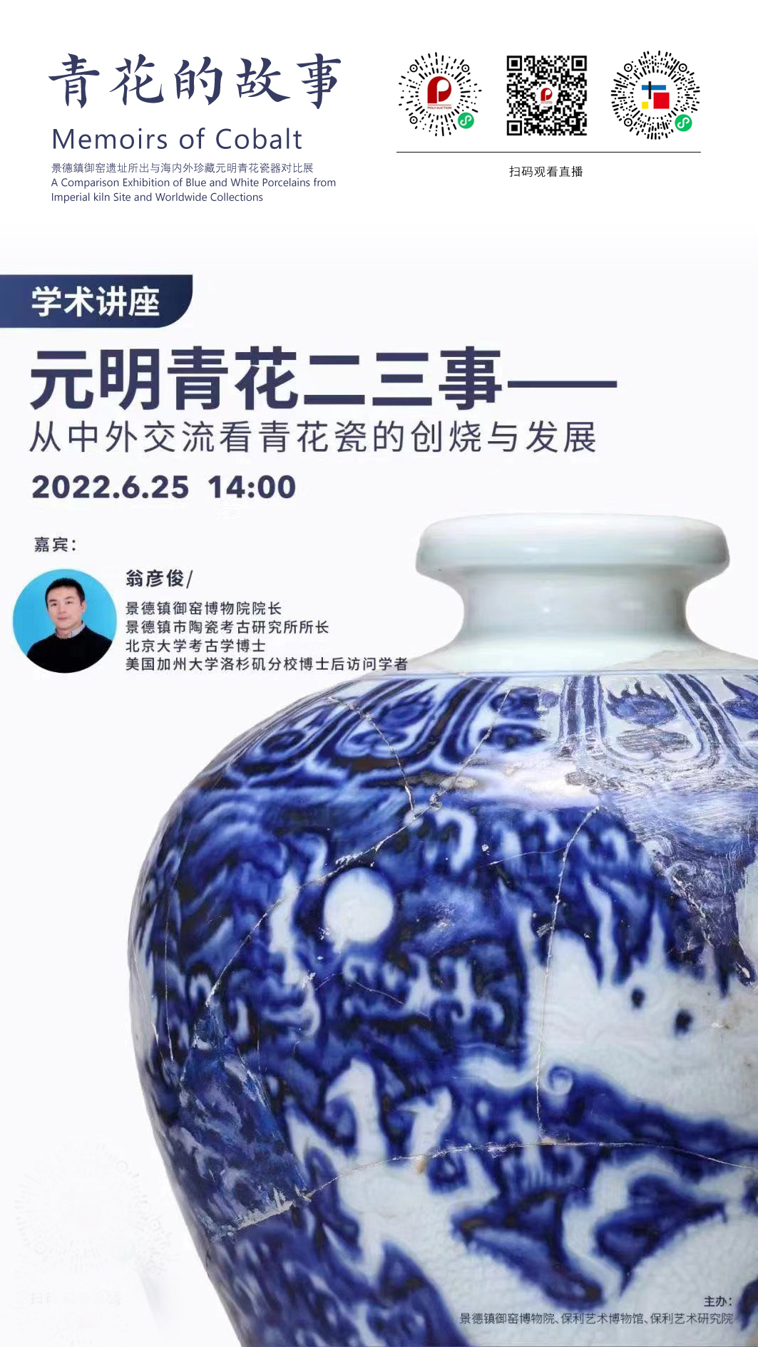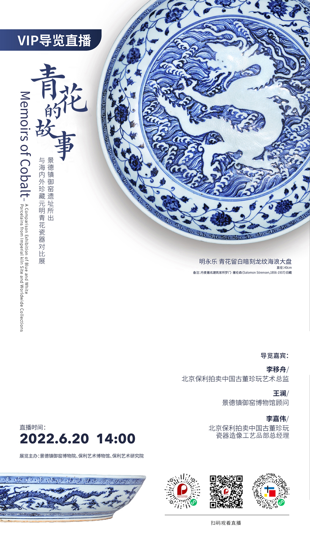 2022年6月20日14:00,“青花的故事”——景德镇御窑遗址所出与海内外珍藏元明青花瓷器对比展VIP导览直播将举行,北京保利拍卖中国古董珍玩艺术总监李移舟、景德镇御窑博物馆顾问王澜与北京保利拍卖中国古董珍玩瓷器造像工艺品部总经理李嘉伟将为大家导览本次特展的重磅展品。此外,几位嘉宾还将在导览现场揭秘一件此前尚未公布的重磅藏品。