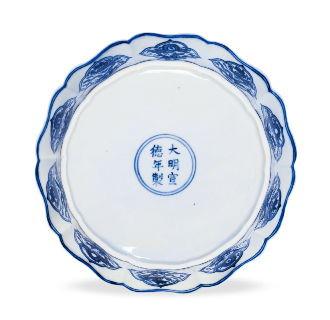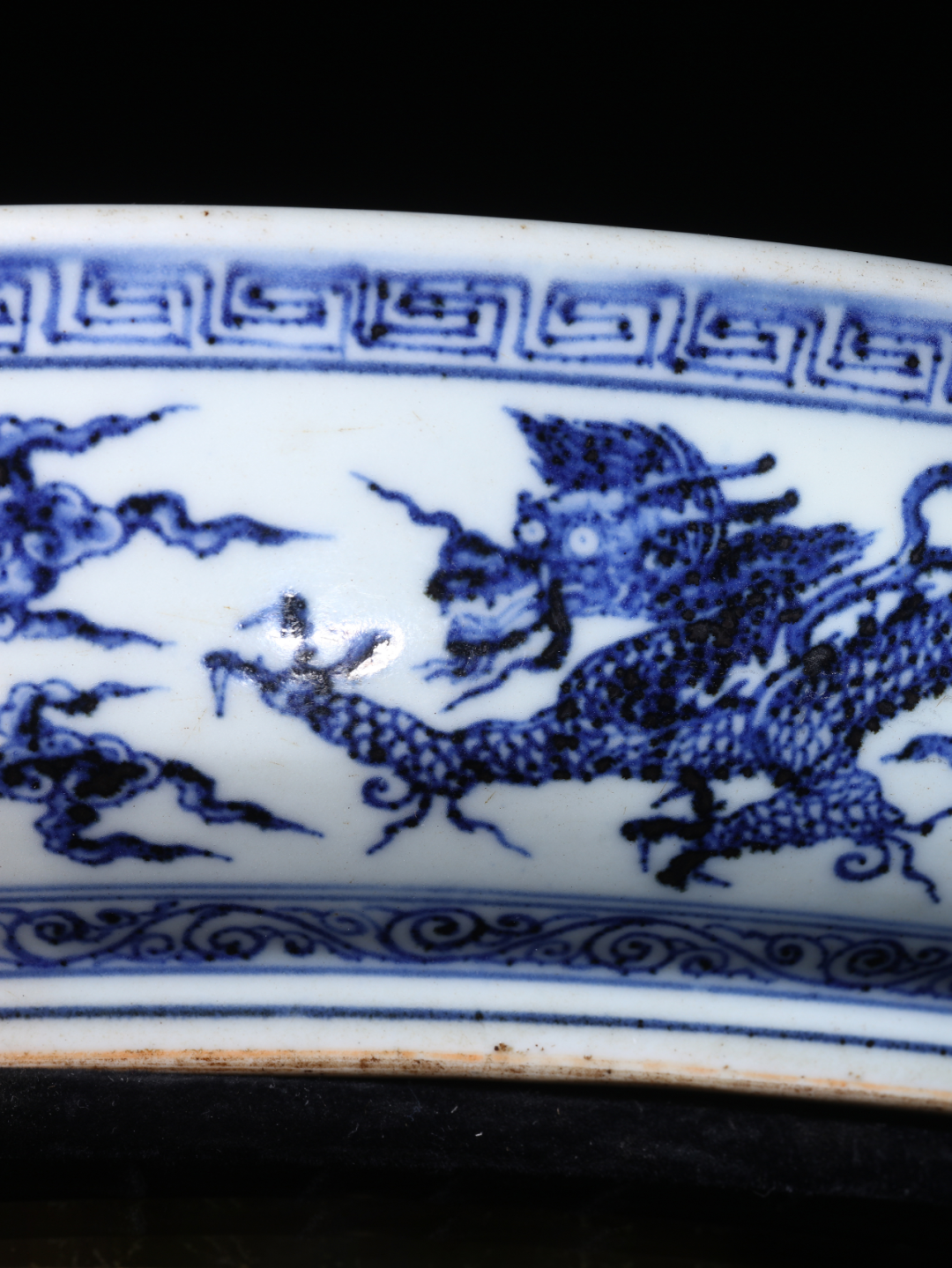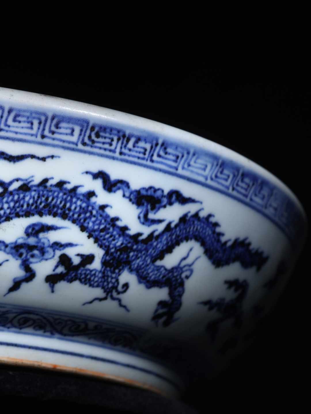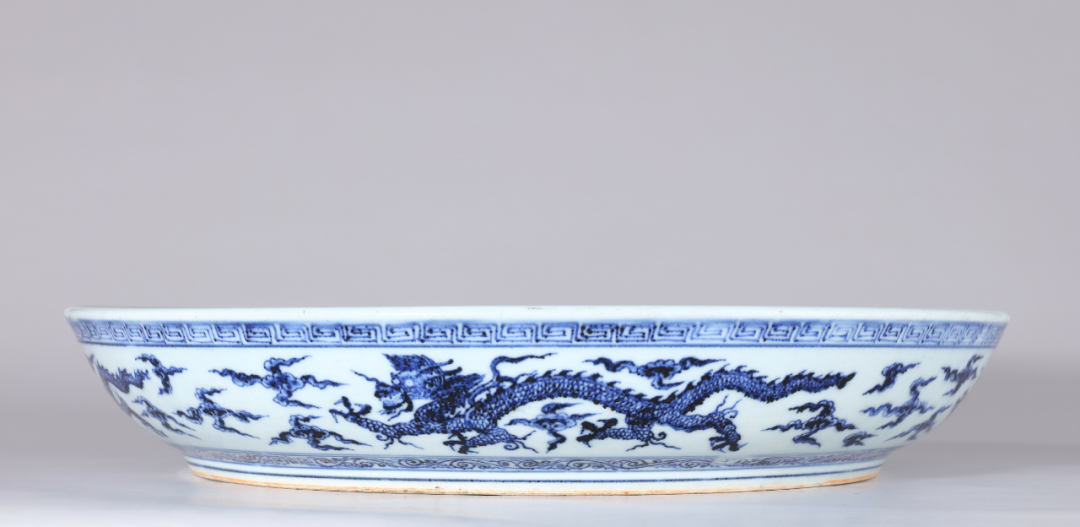 盘底砂底无釉,可见胎体坚致细腻,足沿微泛火石红。通体青花描绘纹饰,口沿内外绘回纹一周,内壁绘牵连缠绕的缠枝花卉十二朵,计有山茶、莲花、月季、扁菊等数种;外壁绘向前奔走的行龙四条,龙口半张,脑后毛发向前竖起,龙须向两侧飞扬,其间以壬字云纹间隔。盘心青花双圈内绘奔涌的海水为地,再以留白技法表现一侧面立龙,仅双目龙睛以青花点绘,龙身下肢朝向画面右侧,身躯中段则向后扭动,使得上肢及龙首面向画面左侧,上肢两只前爪一前一后,龙嘴张开,龙角后的鬃发上扬,气势威猛,身旁围绕的火焰亦以留白技法表现,在青花海水地子的衬托下,使得龙形似乎站立在波涛之上,极具艺术表现力。