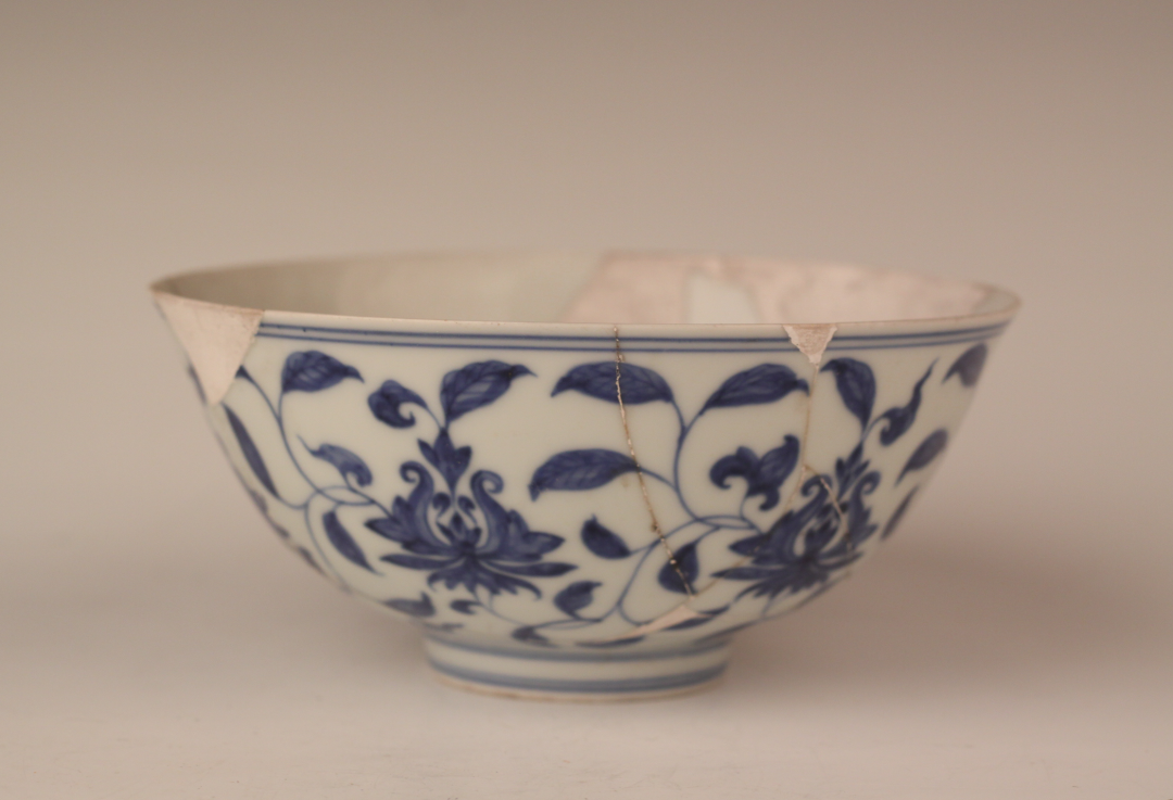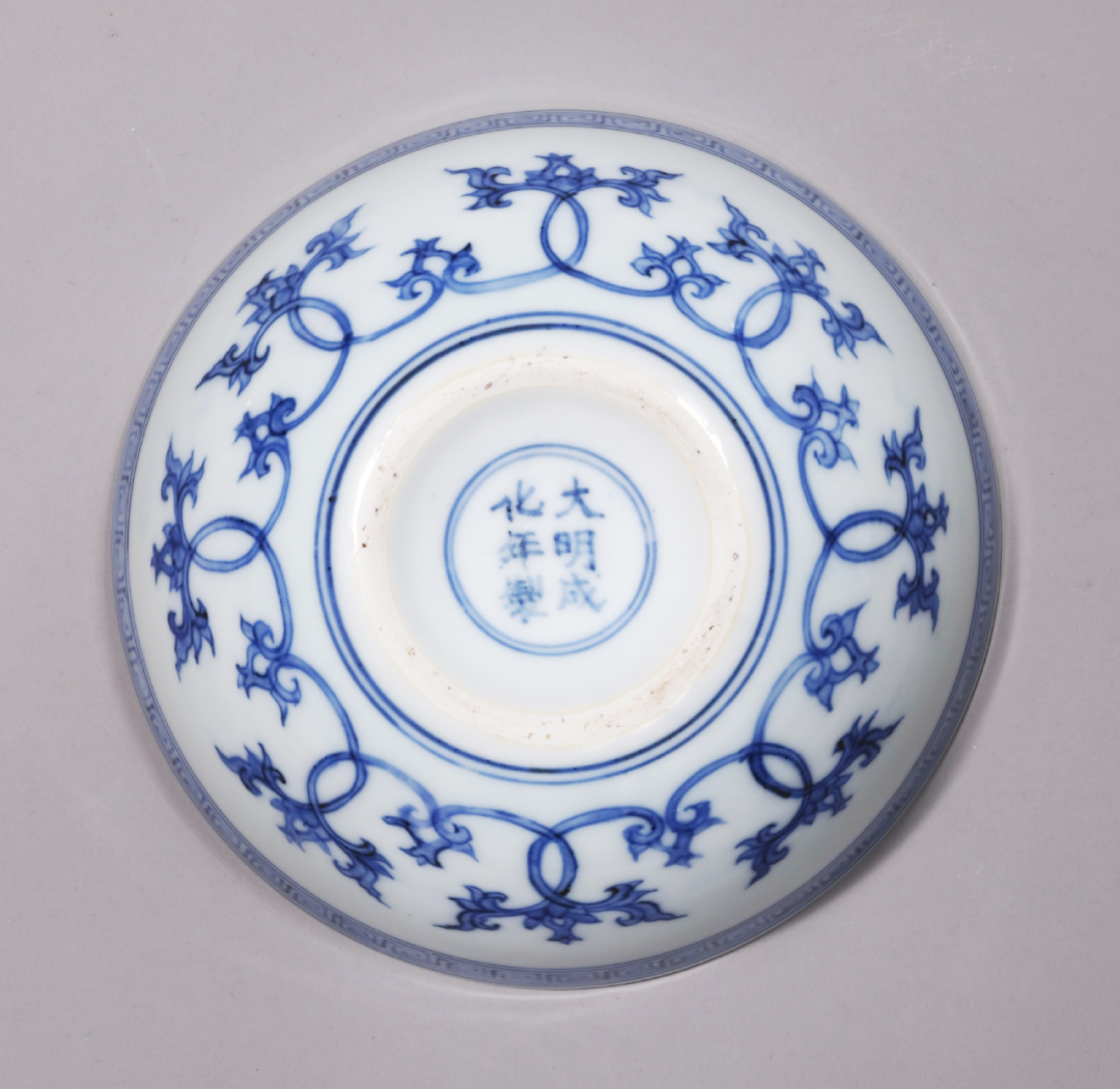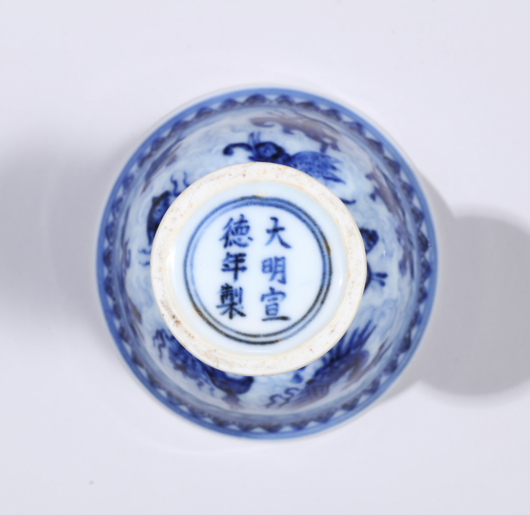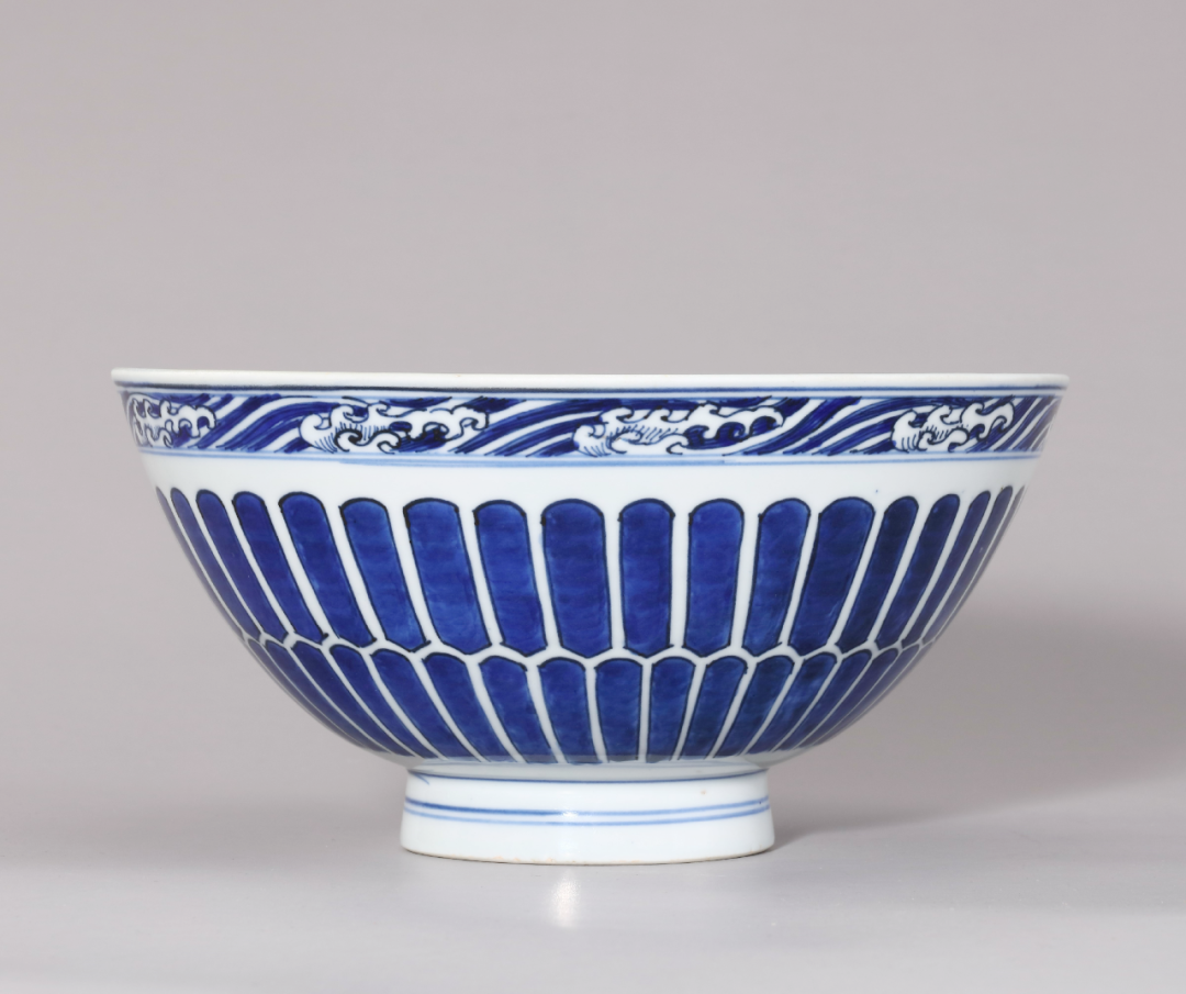 明万历 仿宣窑青花外莲瓣纹内缠枝花卉纹碗