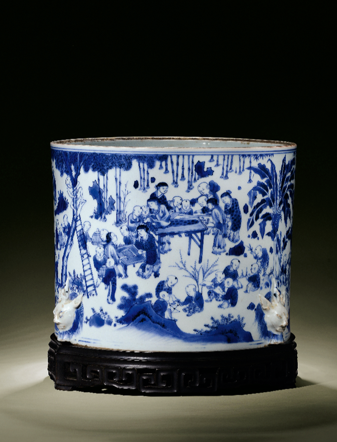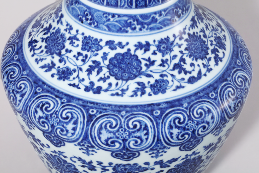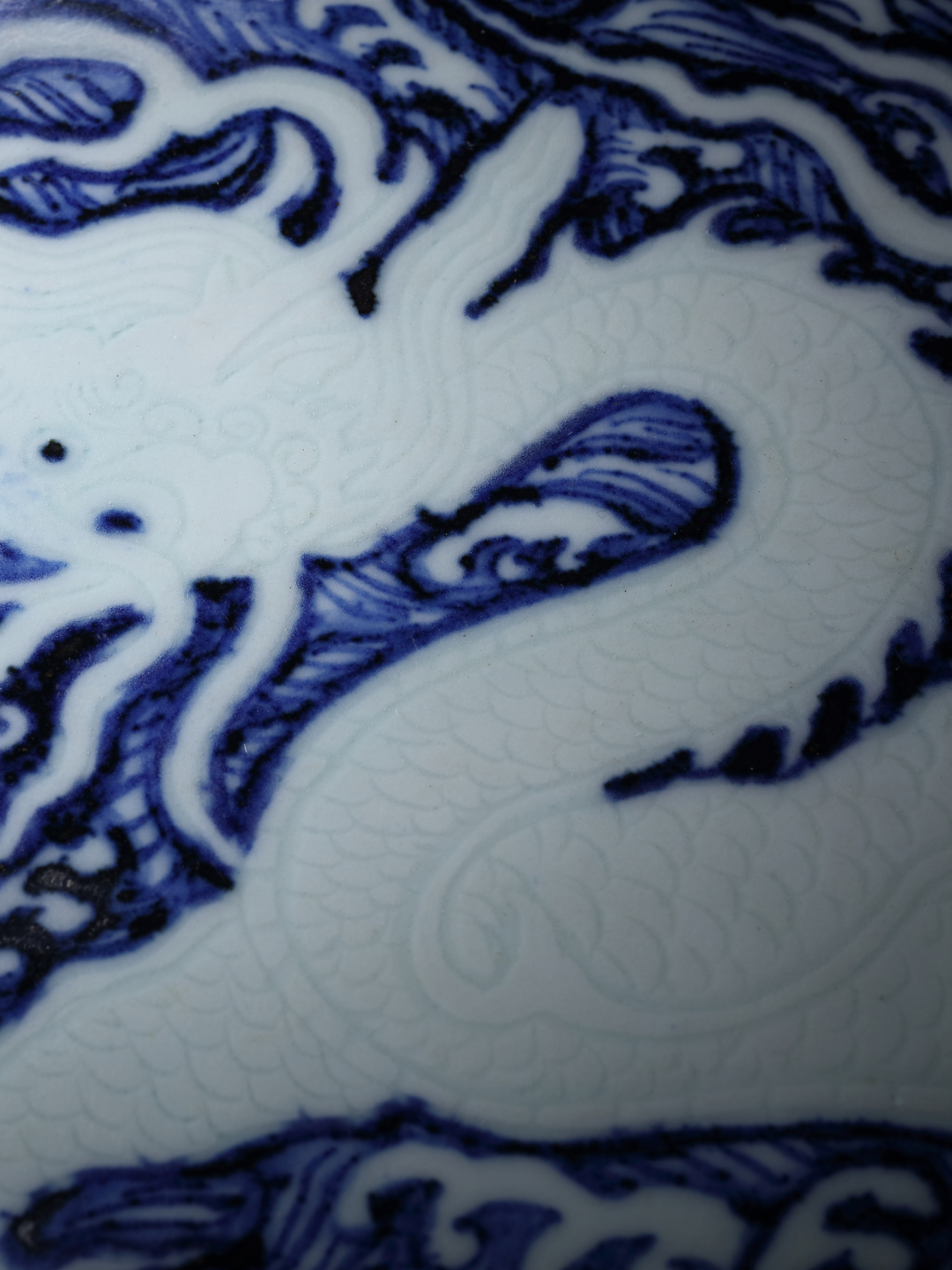 此种留白工艺难度极高,十分考验工匠谋篇布局的功力,制作时须在素胎之上将底稿打好,将需留白的部分之轮廓线以青花勾勒,再将需要以青花表现的部分以钴蓝青料描绘出来,且绘制时也需加倍小心,切不可在留白的区域落笔;最令人叹服的是立龙的鳞片、爪牙、须发均以暗刻工艺表现,施釉后纹饰也十分清晰,纤毫毕露,工致非凡,具有立体效果,可谓鬼斧神工之作。通体青花发色深沉妍丽,尤其色泽浓重处可见明显的铁斑沉积效果,颇得中国传统水墨画的笔墨淋漓之趣,透出凝重雄浑之美。