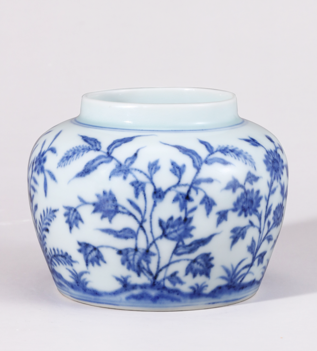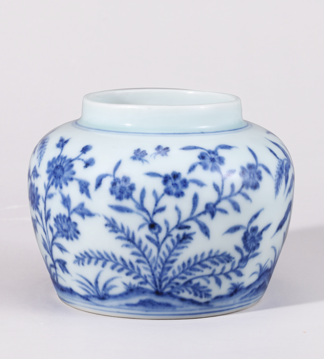 明宣德 青花莲池鸳鸯纹蟋蟀罐