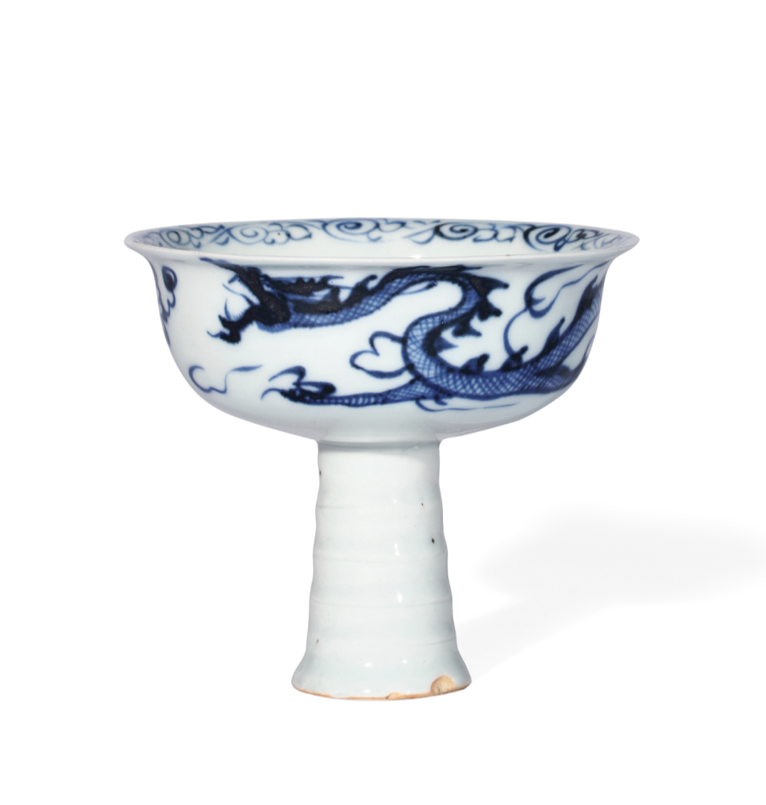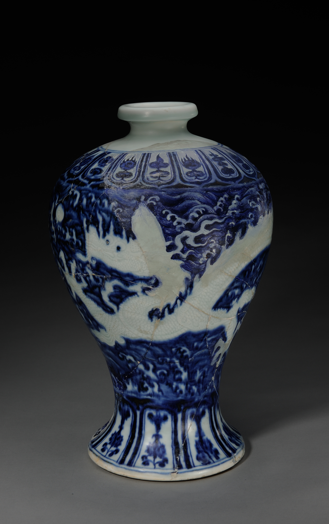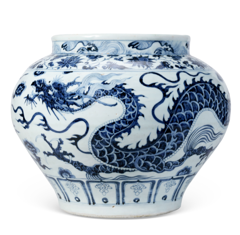 盘心留白而成的白龙纹样于明初青花器中十分罕见,采用此种技法者,所见均为御窑重器,以天球瓶最为知名,北京故宫博物院、大英博物馆大维德基金会、伊朗国家博物馆、日本出光美术馆等均有收藏,此外还有梅瓶、大碗等造型,而究其肇始,母本则应自元代蓝釉留白、青花留白器物而来,前者如扬州博物馆所藏蓝釉留白龙纹梅瓶,后者则见1964年河北保定元代窖藏出土的两件青花留白八棱梅瓶。