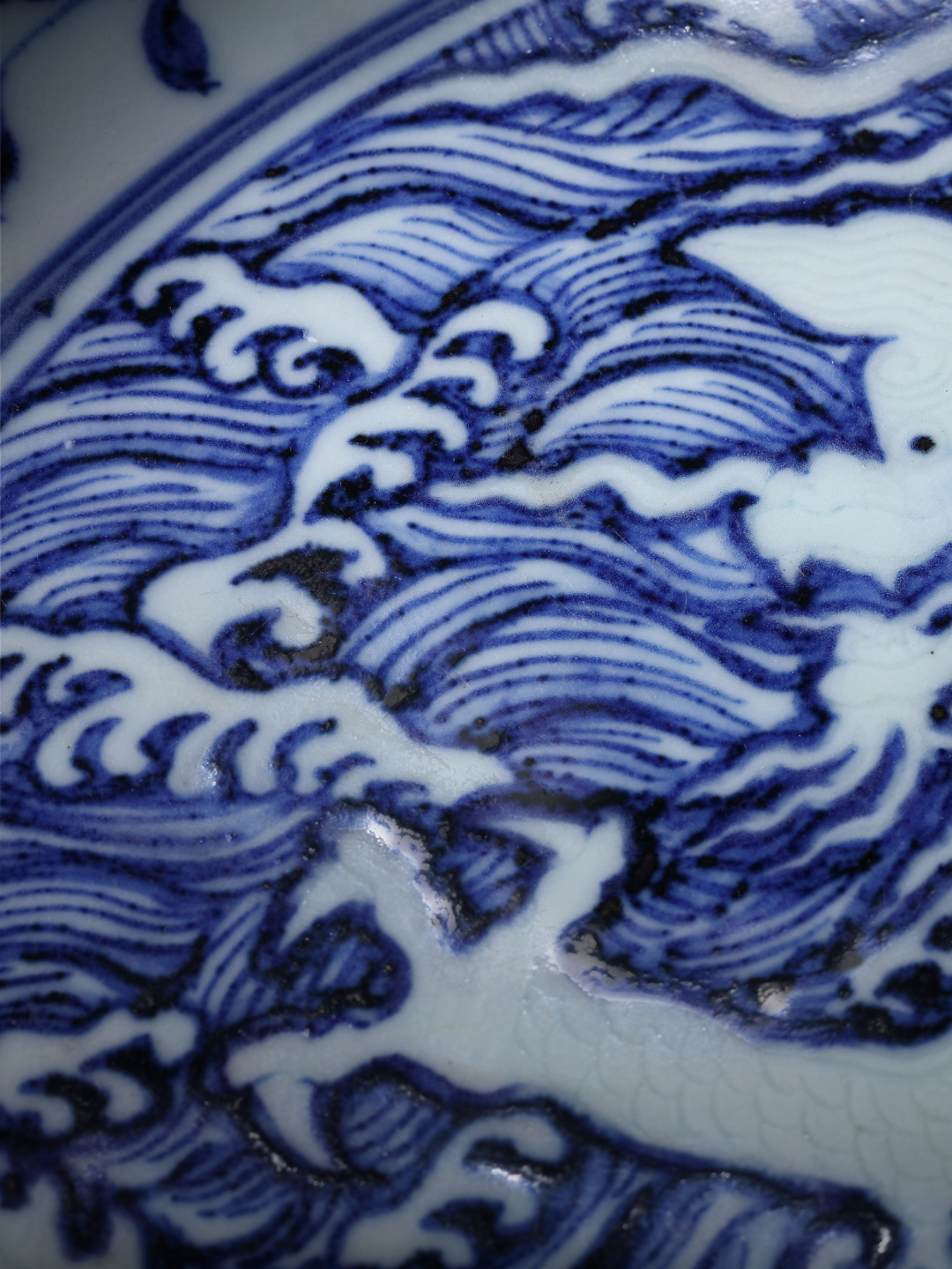 明永乐 青花留白暗刻海水龙纹大盘(塞伦森龙盘)局部