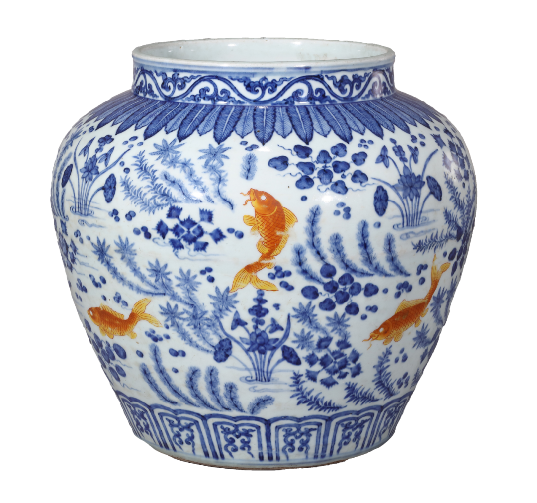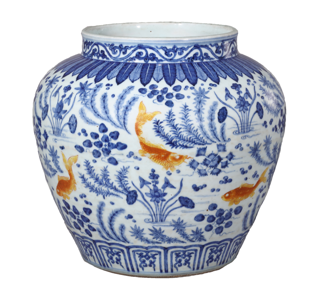 明嘉靖 青花加黄地红彩鱼藻纹罐
