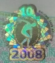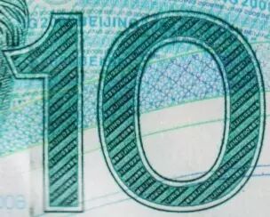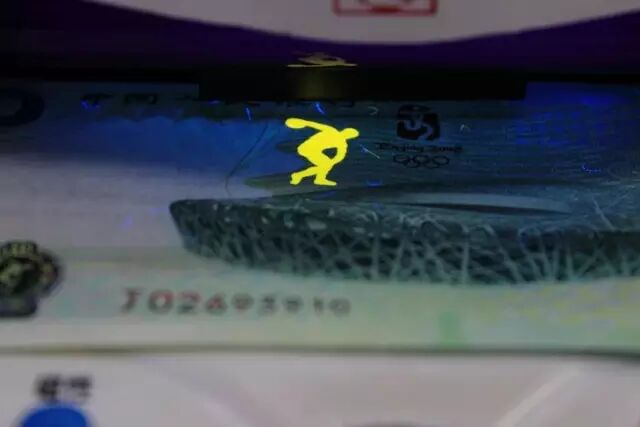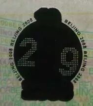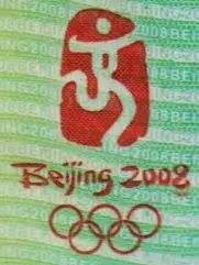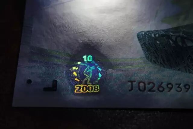 票面背面左侧有5.5毫米宽光变全息开窗安全线,安全线两侧有缩微文字“BEIJING 2008”,中间有全息图案“10”。变换角度观察时,安全线两侧颜色在绿色与品红色之间交替变化。