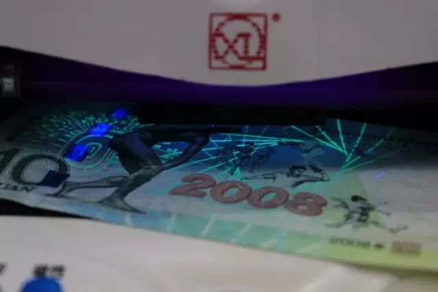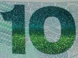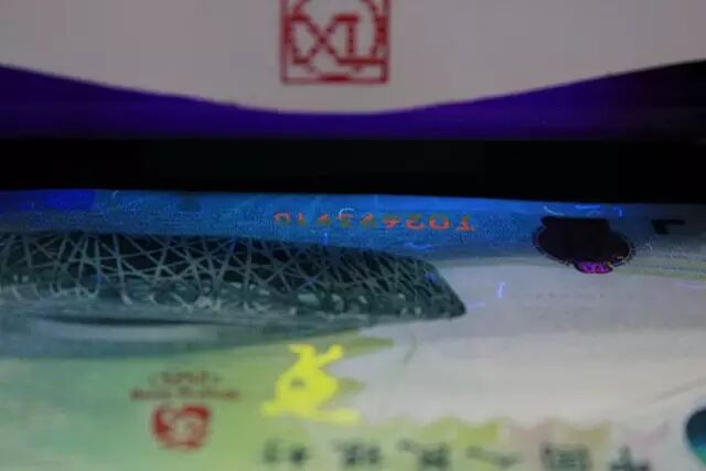 位于票面正面左上方。垂直观察,面额数字呈绿色,中部有横向亮条;平视时,面额数字呈蓝色。随着观察角度的改变,面额数字颜色在绿色和蓝色之间交替变化,同时亮条呈现上下滚动效果。