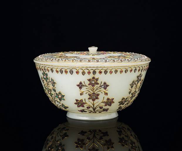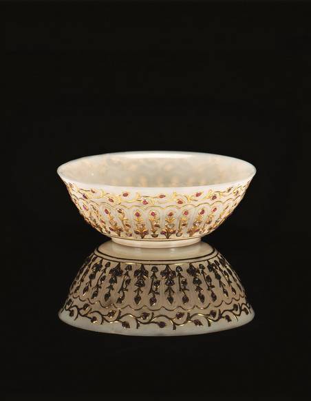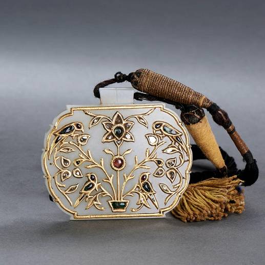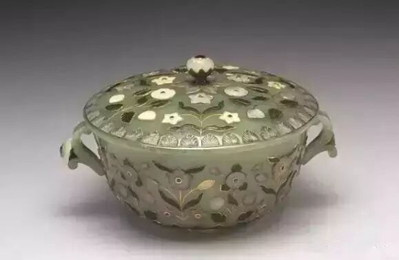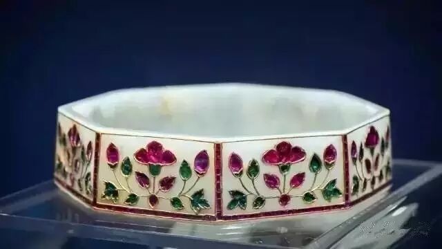 痕都斯坦玉器和一般的中国玉器不同,它善用纤细的金丝或银丝将花纹的轮廓勾出,表现器物的华丽。此外,痕都斯坦玉器上多镶嵌各种玻璃、宝石、金银片或玉片,这与中原传统人文的雅致意韵全然不同,所以对于材料和工艺的要求也更加苛刻,也正是这种精益求精,成就了痕玉无与伦比的美丽。