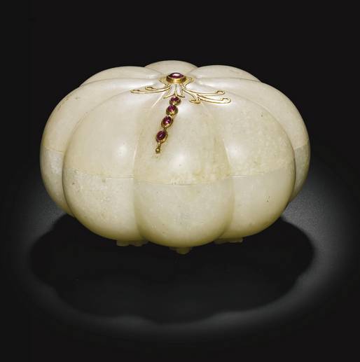 清19世纪 痕都斯坦式青白玉错金丝嵌宝石瓜形盖盒