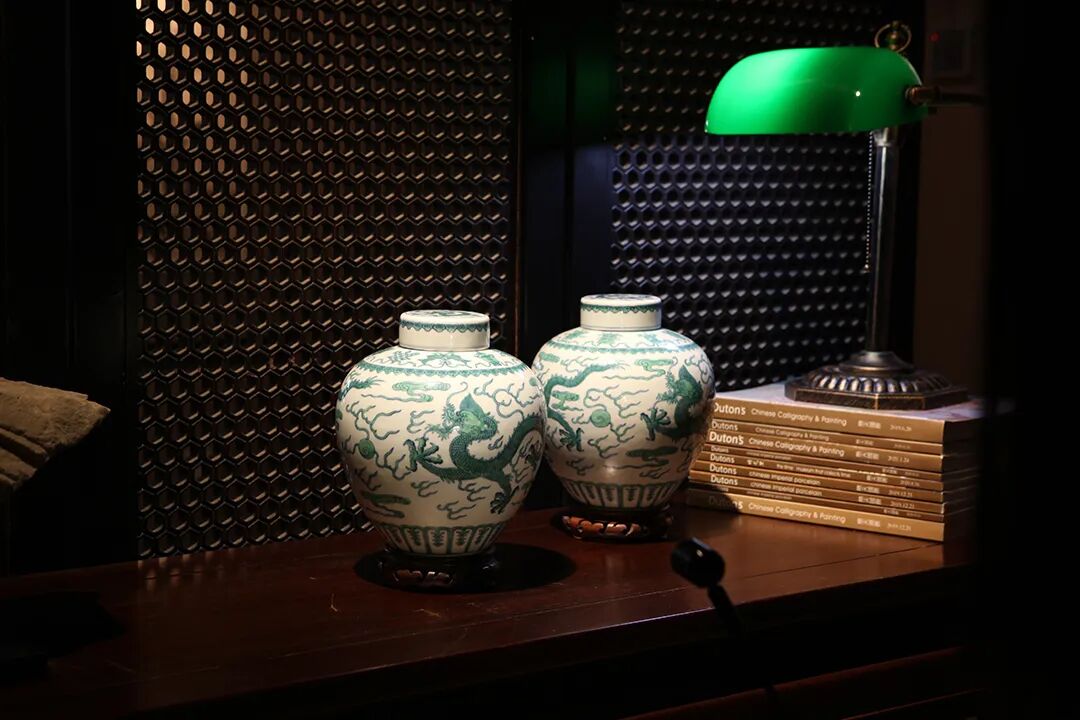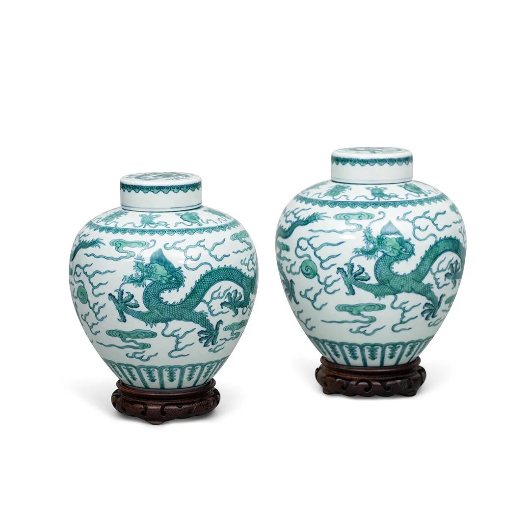 Lot 016清道光 斗彩绿龙云纹罐一对