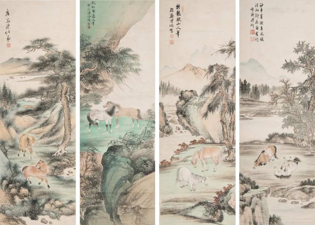 Lot 17溥伒 溥僴 溥佺 溥佐戏马图四条屏