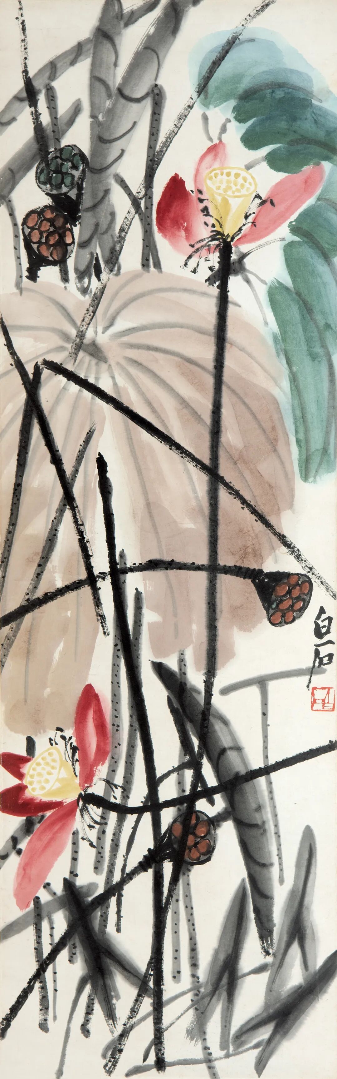 此幅作品是齐白石晚年所作,意蕴丰厚,荷叶以石绿色敷染,掺以藤黄色及墨色,铺毫刷笔,计墨色在于湿、虚实、浓淡中形成自然、和谐的块面;再勾出叶脉纹络,形成如荫似盖的大叶。荷叶用墨浓中有淡、实中带虚,层次丰富,黑色、绿色、褐色相互映照。荷叶藤杆之间用胭脂红涂出荷花。花苞在田田荷叶之间,有一种“万绿丛中一点红”的感觉。几株藤杆粗细、长短不一,彼此交叉着。塘底的涟漪以细劲的线条绘出。下半部的横纵交叉的线条起伏变化,给人一种微风吹动、水波荡漾的感觉。此作为白石老人的得力之作。