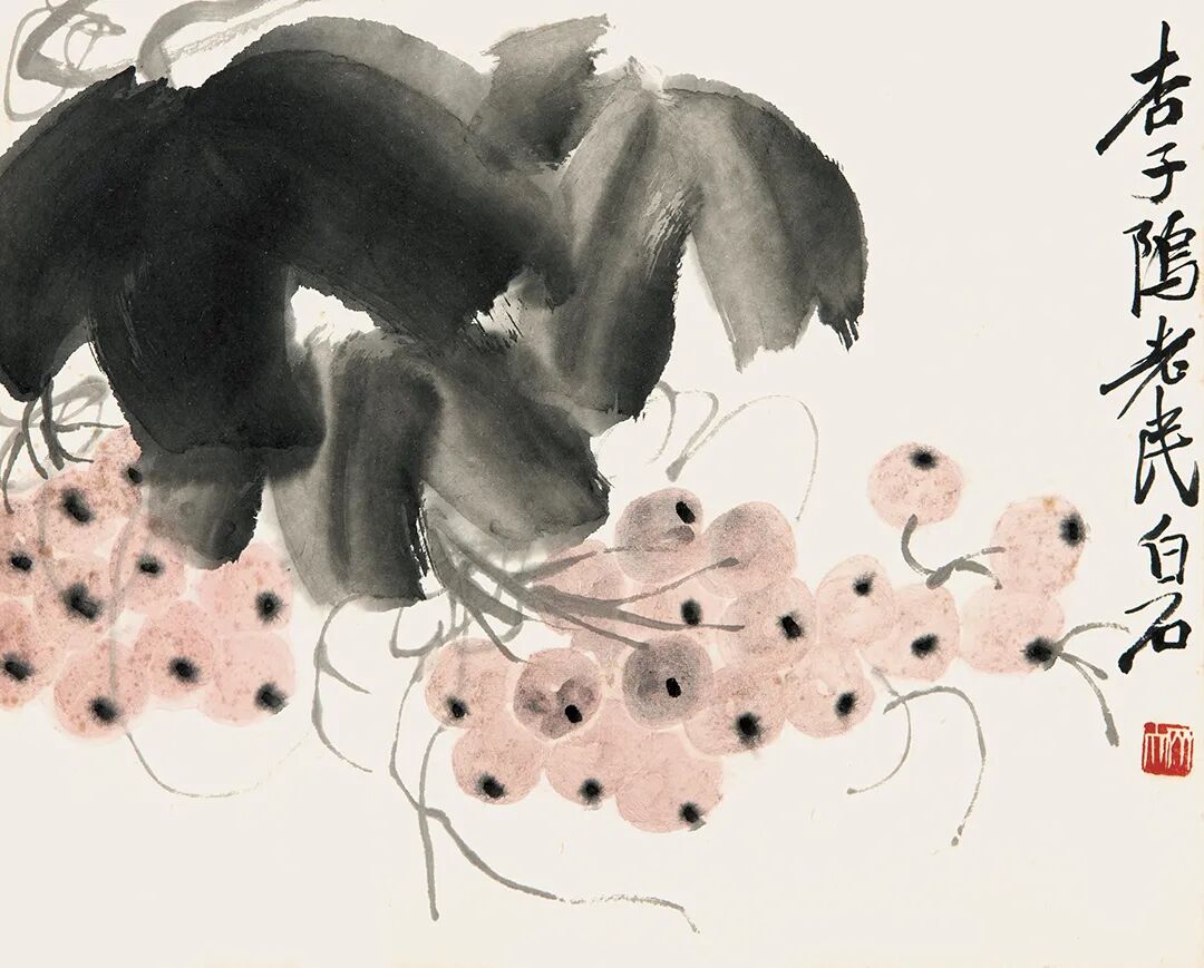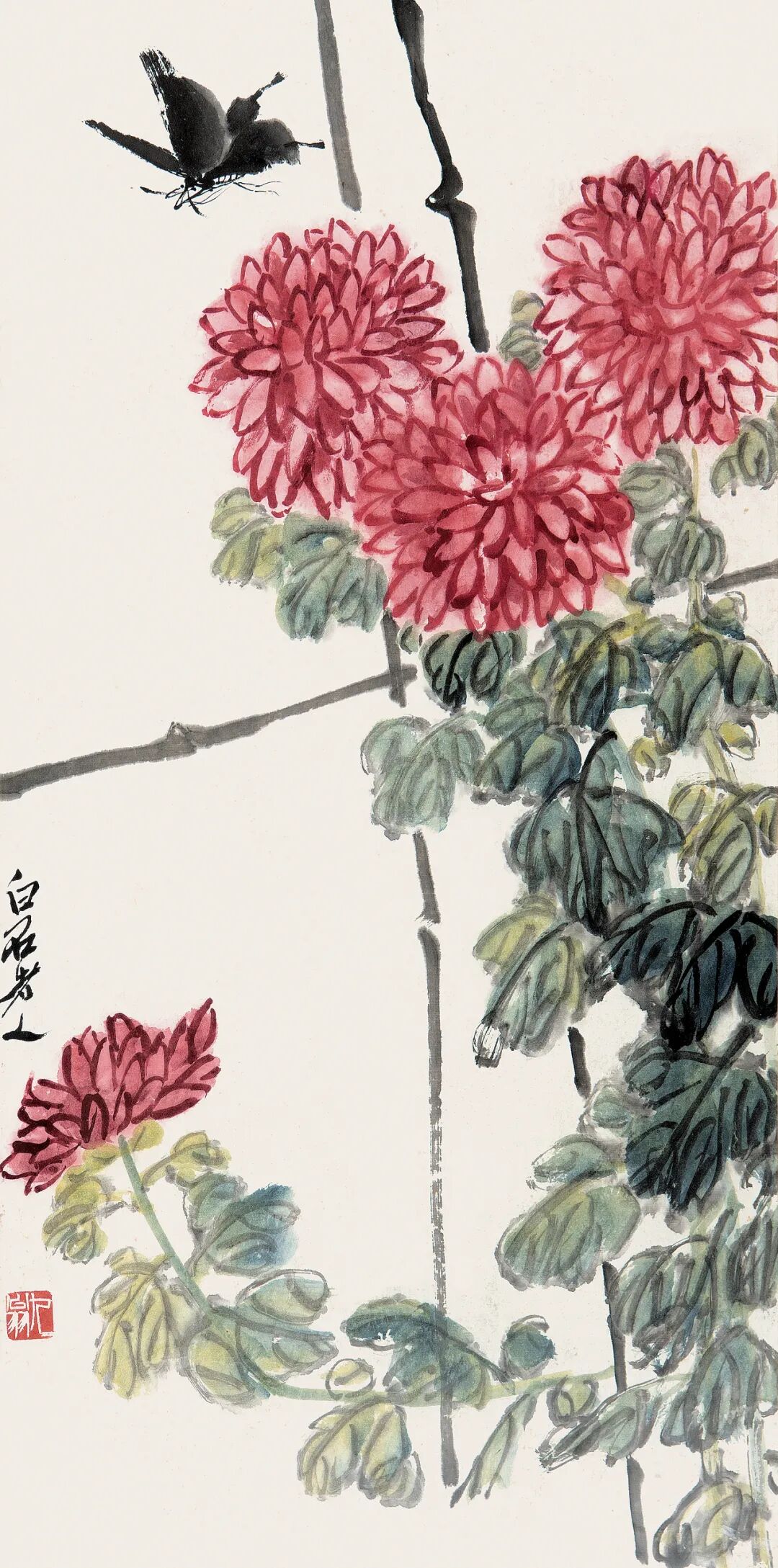 而齐白石对于菊花有着独特的造诣,此幅作品齐白石对点、线、面构成极其重视,用竹子的线条分割画面。画中的菊花,先用洋红勾花瓣,再以淡红色罩染,令花朵浑然一片,菊叶用墨重勾染,但笔画纵逸,与花瓣的笔法大不同。菊花为齐白石的拿手题材,鲜红的朱砂极准确地把人带入到深秋的景象中,一只蝴蝶舞于其中,一下子成为画眼,点亮全幅,活色生香。花间一只蝴蝶,连工带写,用焦墨随便两笔,不但画出了翅膀正在飞舞的状态,并且能把蝴蝶翅膀黑薄而有绒的质感表现出来,这是由于画家多年对蝴蝶的观察体会。齐白石强化色彩表现力,把黑作为一种色彩和其他色彩对照,并大胆引进民间艺术审美特色,使色调更加纯化,体现花朵明亮饱和的色彩。画家一生画菊花很多,除了陶渊明和历代文人的影响,主要是因为菊花与他的早年记忆有很多关联,而他也喜欢菊花所象征的秋天和“独耐人间冷”的品格。因此他笔下的意境更是富有淳朴与天真的自然气息。