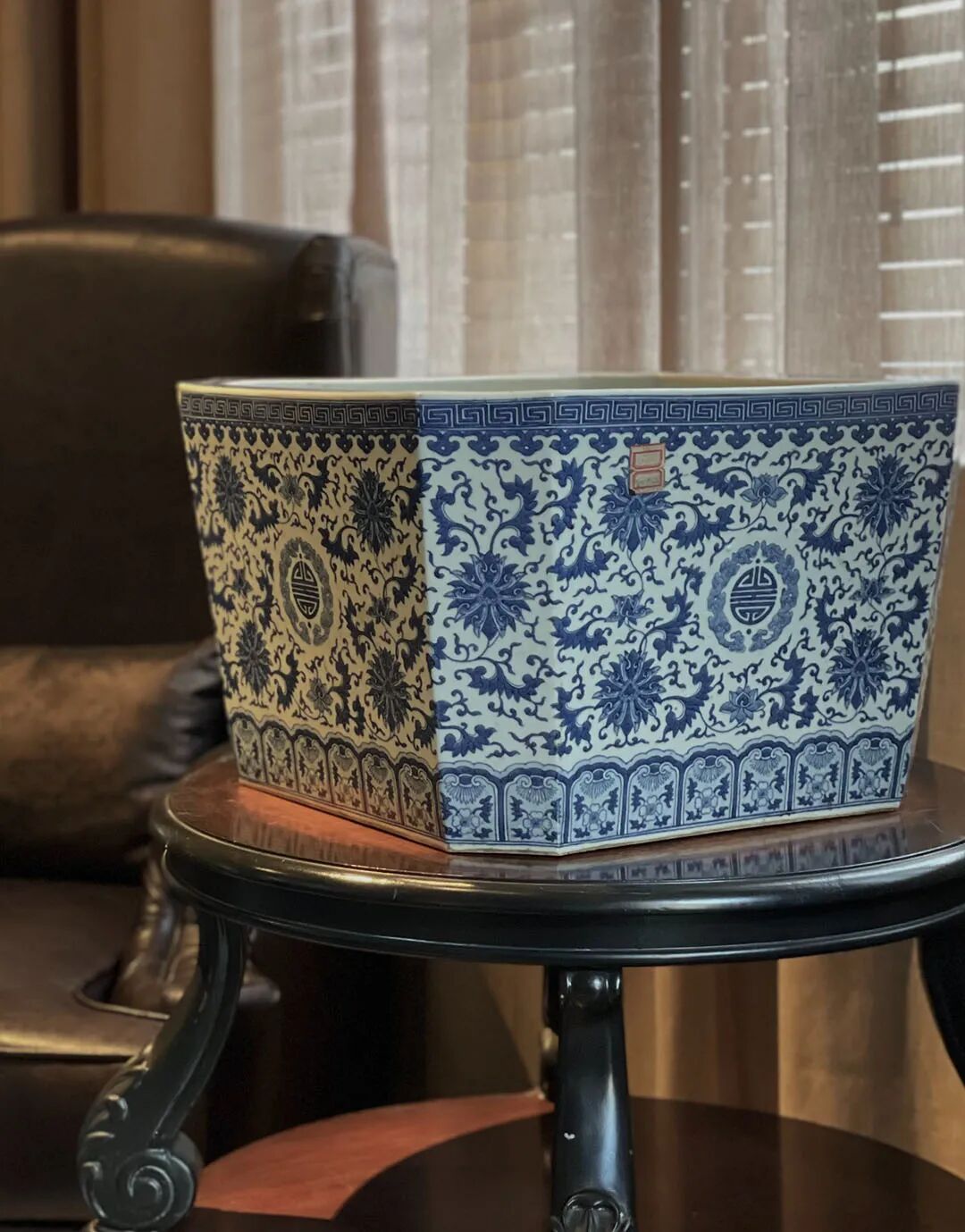 此造型自元代青花就有标本发现,一直到晚清宫廷用品用途有“冰鉴”一说。本品为现存已知公私收藏中光绪御窑青花瓷器中体量最大,烧成难度大,器物发色鲜活,实为晚清御窑巅峰之作。