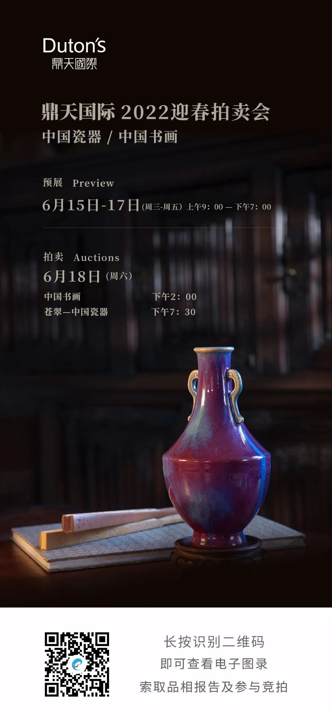 鼎天国际『2022年迎春拍卖会』已在天津市和平区睦南道145号鼎天国际时光里进行预展。「中国书画」和「中国瓷器」两大专场分别于6月18日下午2点和晚上7点30分举槌。联拍在线将全程直播,并提供实时同步竞拍技术和服务支持。
