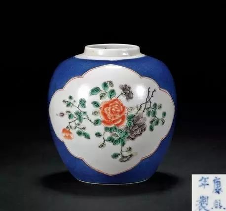 清康熙 洒蓝釉开光五彩花卉小罐