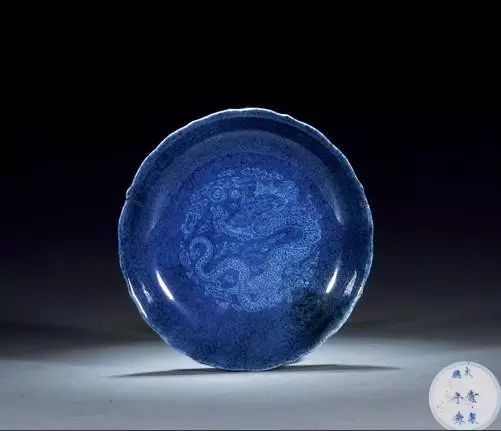 清康熙 洒蓝釉留白云龙纹花口盘