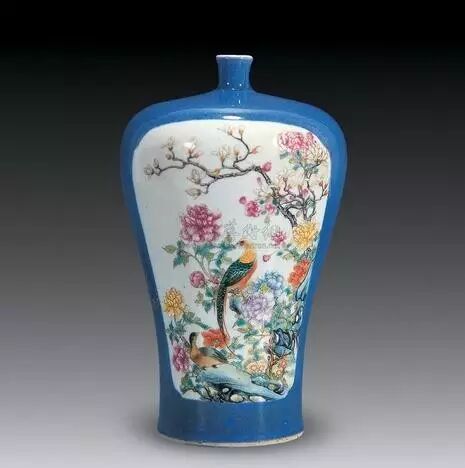 清 洒蓝釉开光粉彩花鸟纹梅瓶