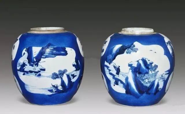 清康熙 洒蓝釉开光青花山水人物纹罐 (一对)