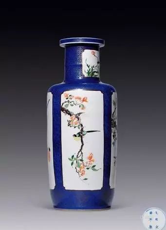 清 洒蓝釉开光五彩花鸟纹棒槌瓶