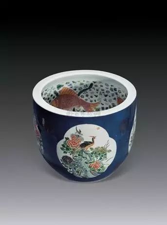 清 洒蓝釉描金开光五彩花鸟纹罗汉缸
