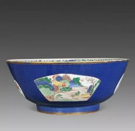 清康熙 洒蓝釉开光五彩山水人物纹碗