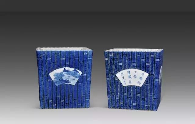 清 洒蓝釉开光青花山水人物诗文竹节花盆 (一对)