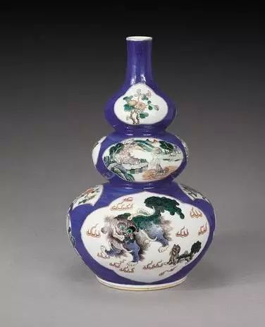 清 洒蓝釉五彩开光人物狮纹大吉瓶