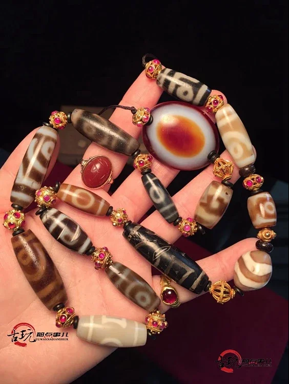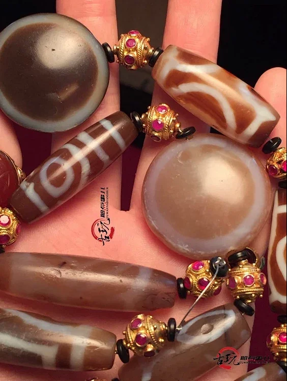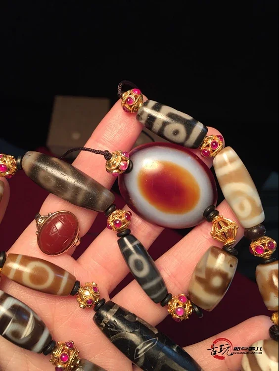 所谓朱砂点是一种红色的斑点,从里到外自然生长在天珠的珠体上,但并不是每一颗天珠上都有朱砂点,也不表示有朱砂点的天珠就是好天珠。同样在天珠上也有发现黑色的斑点,经佩戴后,有慢慢淡化儿转变成红色斑点的例子。经研究判断,这种红色斑点可能是天珠与人体的磁场融合所生长出来的。包浆不是天珠上的污垢,是酸、碱、分子与本体分沁物长期融合的一种附着物,它是洗、刮不掉的,就像旧瓷器、明清家具上的包浆一样。这种包浆滑润自然,任何作旧都不能做成这种自然形成的包浆,“自然成旧”与“人工作旧”是不可同日而语的,岁月的残缺是一种美,人工的“做残做旧”越看越丑。【古玩那点事儿出品】:千年镶蚀玛瑙古珠措思天珠马眼板珠古珠赏析小集合