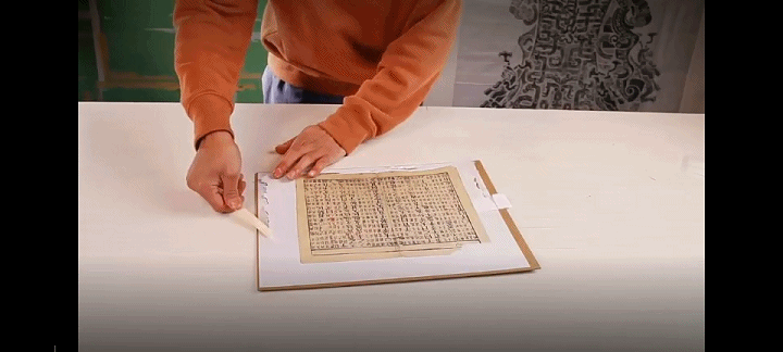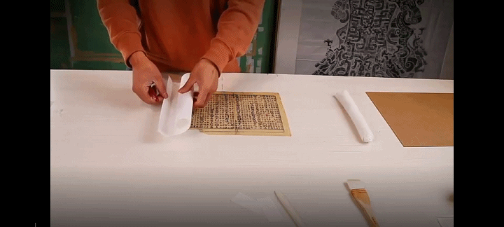 我们先将托心纸卷成一个卷,一只手持托心纸卷与古籍书页边(距约3cm处)开始贴合,另一只手持硬毛刷,两手配合释放速度,将托心纸刷平。