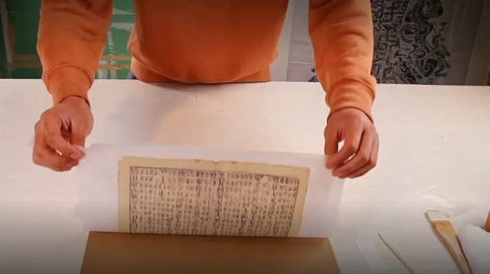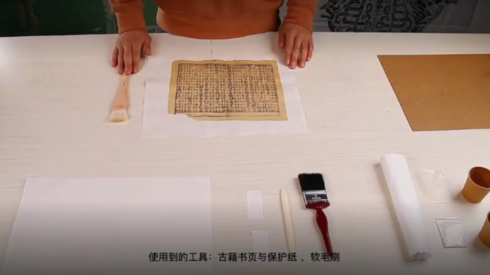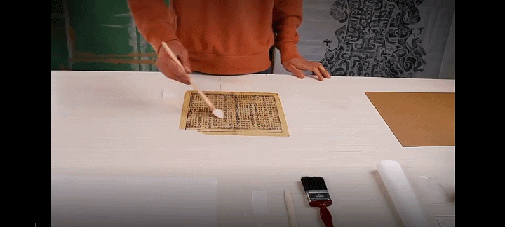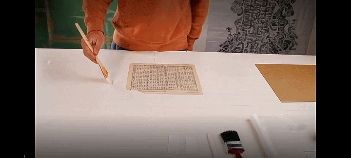 清洗后静置五分钟,由于古籍残页与保护纸之间会有一些气泡,所以还需要用宝盒材料包里的软毛刷轻扫,将空气排出。