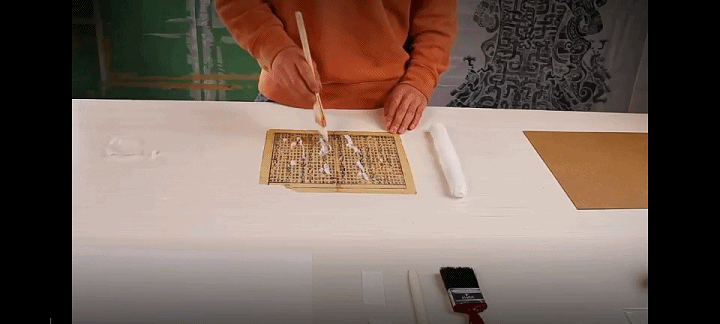 气泡全部推出后,再用材料包里的毛巾将多余的水分擦干,然后打开浆糊包,将三分之二的浆糊挤到古籍残页上,用软毛刷涂刷均匀即可。