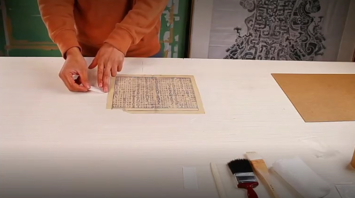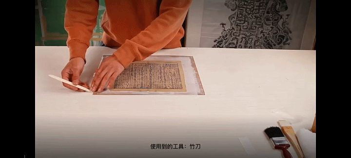 再将书页裱件完整揭下并放在纸墙上,再用硬刷轻扫使其与纸墙完全贴合。