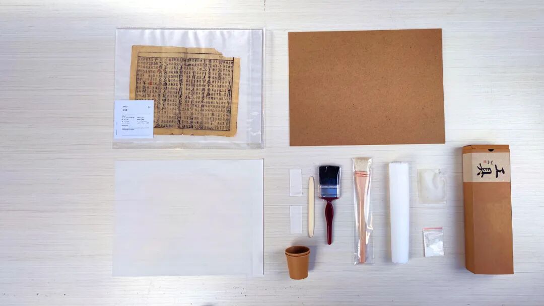 盒子里装着古籍修复需要用到的工具和步骤说明书: