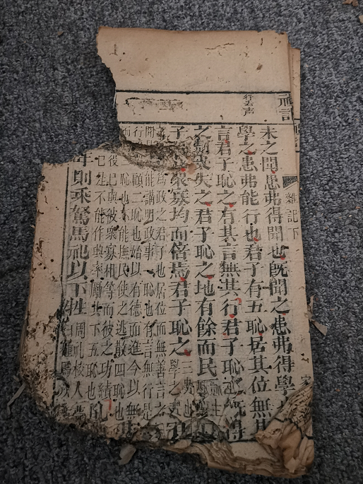 破损的古籍书页静静地躺在盒底,它对这场与“古籍守卫“的会面已经期待了许久……