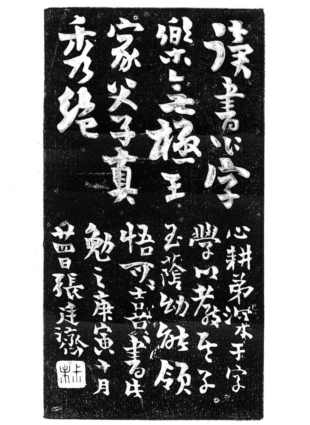 背铭文:“读书作字乐无极,王家父子真秀绝。心耕弟深于字学,以教其子玉荫,幼能领悟,可喜可喜,书此勉之。庚寅(1830年)十月廿四日,张廷济”、钤印“尗未”带天地盖、带日本包装、包装题识“箱表书,子爵山口弘达,黄石山人号”我之叹息有二,一为惜叹:嘉庆三年(1798)戊午科浙江乡试的解元,怎地在之后进京应礼部的会试中,屡试屡踬,终不及第,灰溜溜退出春闱(闱,考场,明清会试每三年一次,于当年春季举行,故谓春闱)赛道,转身结庐深隐,有人说这是潇洒,其实几多无奈无从说,愁绪满怀心底埋。二为感叹:无奈转身之后,张廷济由叔未而海岳庵门下弟子及至眉寿老人(叔未、海岳庵门下弟子、眉寿老人均为张廷济別号),人生却由晦及明,一路向阳,生命的高光映照人生历程,熠熠生辉。唐寅也是戊午科乡试第一,所不同者,唐寅为明代苏州人,所举为明弘治十一年(1498)南京秋闱(明清乡试于当年农历八月举行,故谓秋闱),高中第一,自然得意,唐寅有“南京解元”印纪其事。谁料得唐寅也折戟礼部会试,但是与张廷济不同,唐寅不是输在答卷上,而是受累卷入当年“试题泄露案”中,从此命入他途,艺术人生由此辉煌。这是联想,不是比拟二人。相隔三百年,先后为比邻两省之乡试解元,居然都是止途会试而赢得艺术人生,是巧合,也是故事。不可否认,张廷济输掉了会试考卷,但是,人生是一份大卷,他输的是小卷,赢的是大卷。以绘画作比,会试乃小幅,焦点透视耳,人生是长卷,当作散点综览。张廷济一生享年八十又一,耄耋高年在清代文化名人中占席长寿者行列,一生以图书金石自娱,凡金石书画刻削髹饰之属无不搜集,建清仪阁,并一一系以诗题藏之。成就如何?有《眉寿堂集》、《桂馨堂集》、《清仪阁金石题跋》、《清仪阁古印偶存》、《清仪阁诗存》等印行传世,可谓洋洋大观,后世仰翘。然而才情兼备的文人有脾气也有“不良”习气。张廷济擅文擅诗擅铭辞,慕其名求其铭砚者大有人在,他不推辞,因材施艺,然得铭心佳句则无以忘怀,遇材质相仿佛之如意佳石甚至不避重复,复刊其上。而受者明知眉寿老人复铭旧句,依然欢喜,为什么?因为此等铭文往往为眉寿老人窃喜,不累重复,是因为老人得意。张廷济为王心耕铭、王逢辰藏端石矩形砚,长十二·五厘米,宽六·八厘米,厚一·九厘米,石质溫润细腻,耐玩耐用。砚背铭文满底,书法朴拙,刀法利落,字口深而有象,金石意味与书法意趣和谐一致。王心耕名福田,金石收藏家,张廷济的同乡好友,持砚属铭乃为其子所求。铭文及跋曰:“读书作字乐无极,王家父子真秀绝。心耕弟深于字学,以教其子玉荫,幼能领悟,可喜可喜,书此勉之。”此铭之后,有同里后生亦求铭,张廷济再作复题,皆大欢喜。或谓省事,不是,因为得意。眉寿老人嘉兴人氏,嘉兴向来文风昌盛,清嘉道年间金石风气尤盛,与眉寿老人奖掖、鼓励后生不无关系。“读书作字乐无极,王家父子真秀绝。”其实何止王家父子,徐家张家陈家吴家亦如斯,此正可为眉寿老人佳铭复题作注脚。