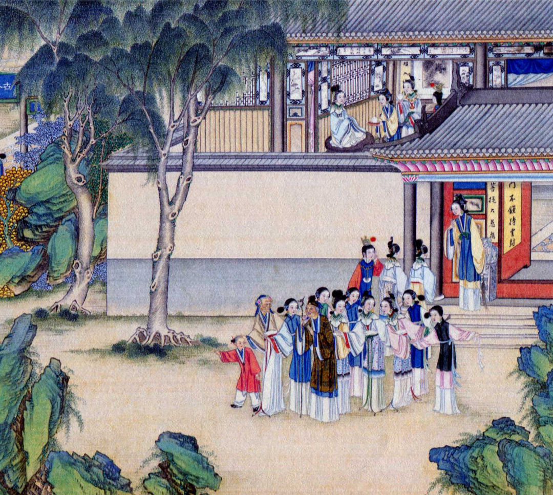 宝玉留神看她是怎么行事。只见妙玉亲自捧了一个海棠花式雕漆填金云龙献寿的小茶盘,里面放一个成窑五彩小盖钟,捀于贾母。贾母道:“我不吃六安茶。”妙玉笑说:“知道。这是老君眉。”贾母接了,又问是什么水。妙玉笑回“是旧年蠲的雨水。”贾母便吃了半盏,便笑着递与刘姥姥说:“你尝尝这个茶。”刘姥姥便一口吃尽,笑道:“好是好,就是淡些,再熬浓些更好了。”贾母众人都笑起来。然后众人都是一色官窑脱胎填白盖碗。
