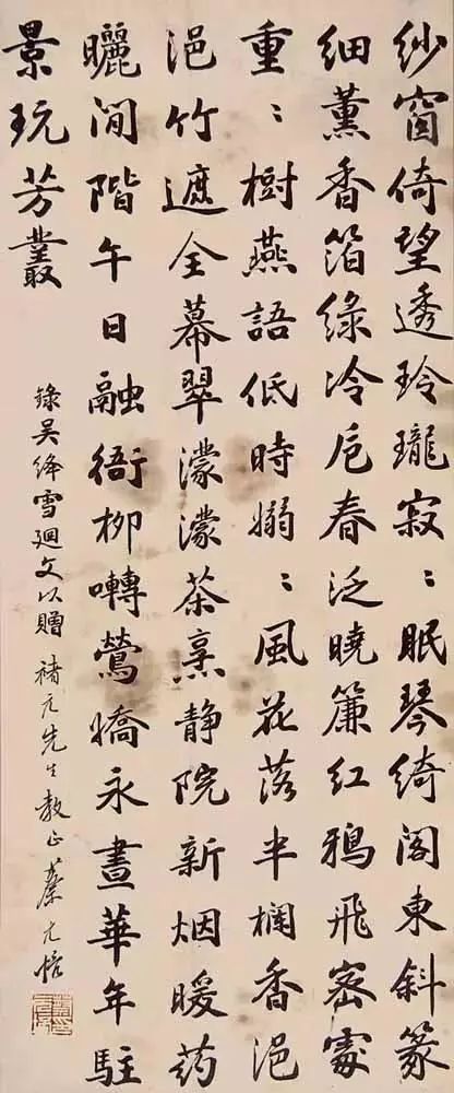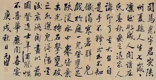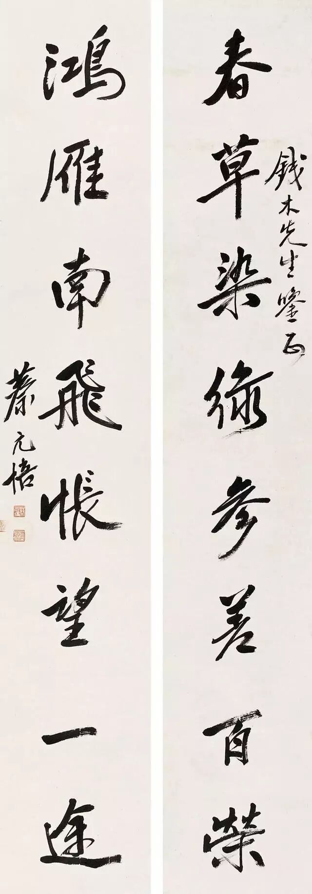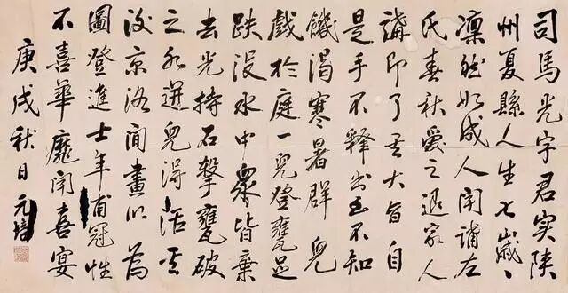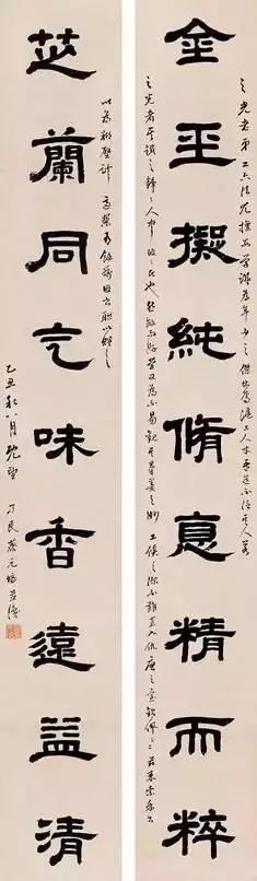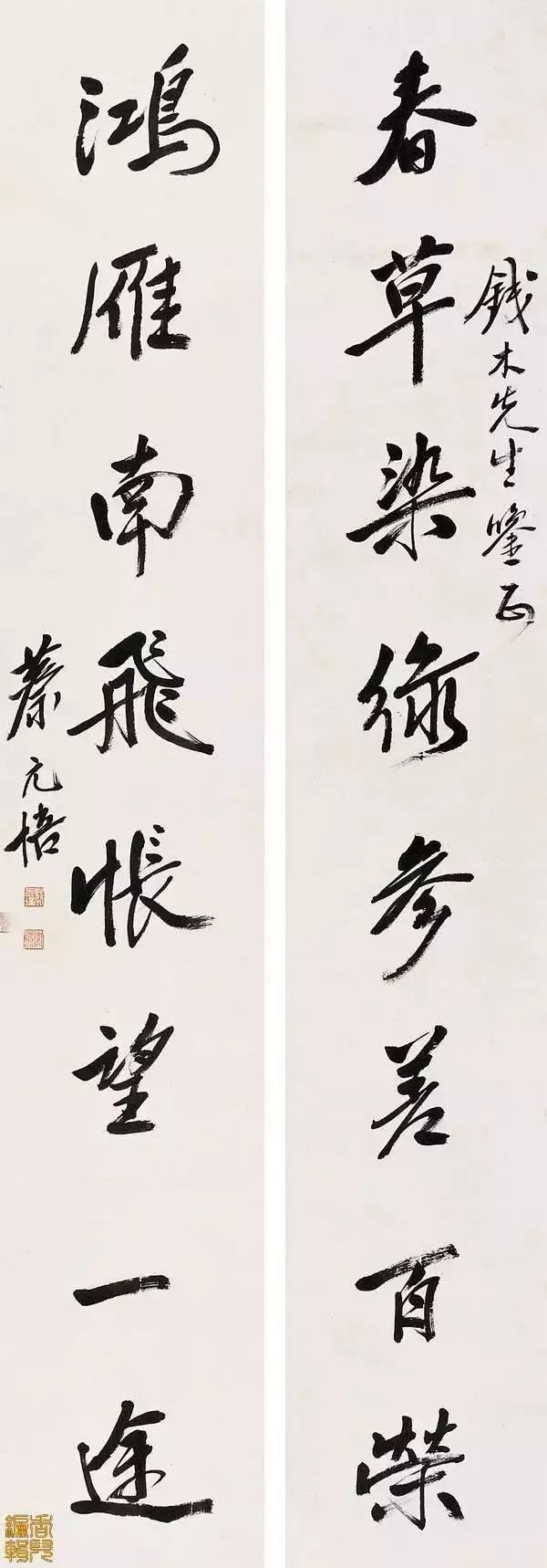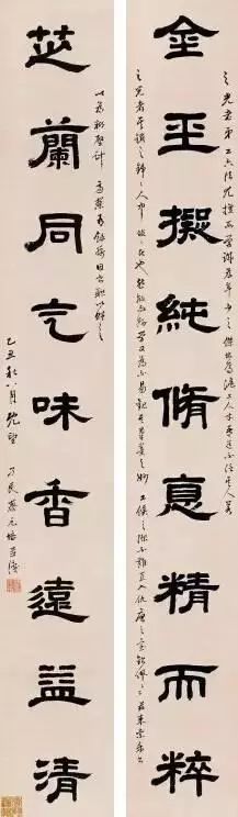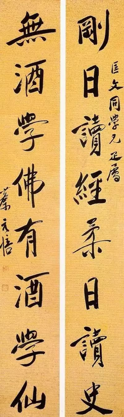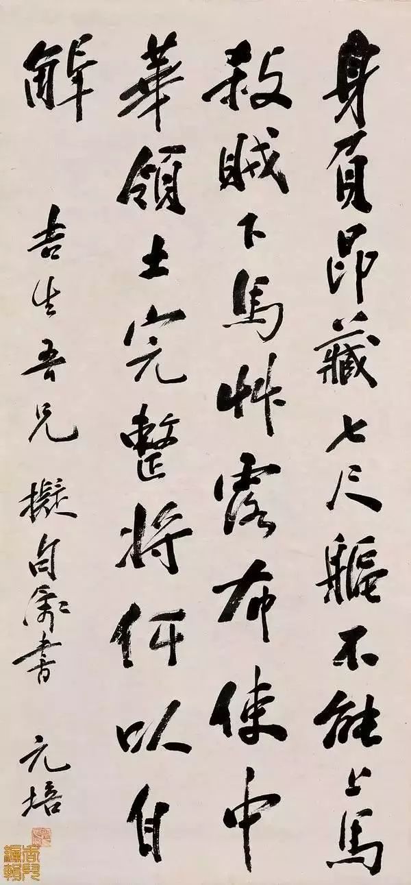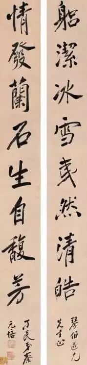 他的书法,一扫清代科举制下书坛的清规戒律,而以线条粗细自然变化,用笔提按顿挫徐疾有致来体现其作品的节奏感。在整体上,布局虚实结合、疏密得当,虽他的字结体有左低右高的略微斜势,但通篇则行气连贯,反而有顾盼生姿的动态。