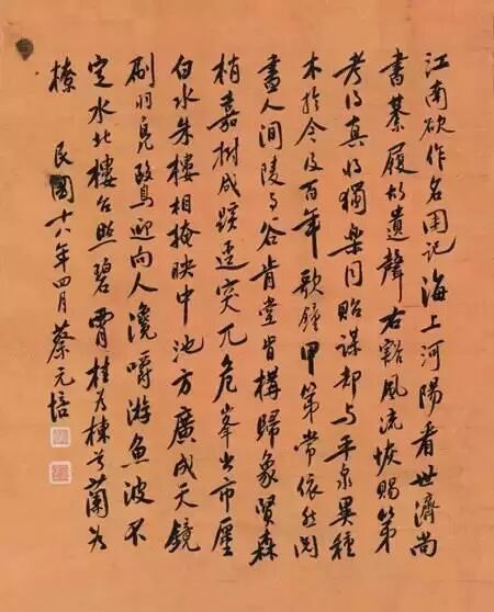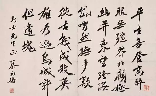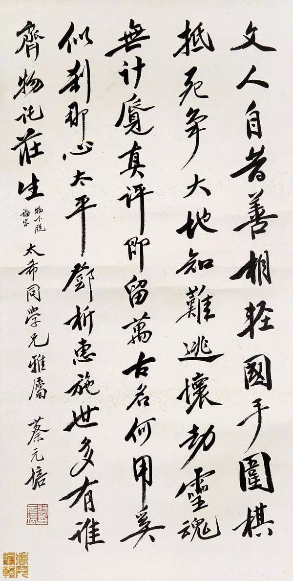 蔡元培先生是一位温厚宽容的人。这从他质朴气清、疏朗宽薄的书风中似乎也可体现。他一生从事教育,并倡导美育,对有关涉及美育者,即文艺、诗歌、音乐,书画,建筑、雕刻等都有所爱好。