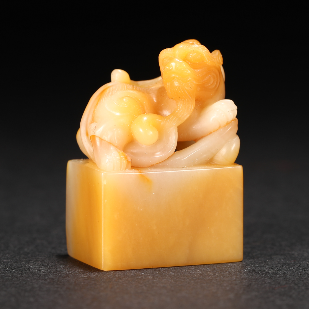 “银裹金”原指白田中有较多的黄心,或田黄的白皮稍厚稍多的,皆统称为“银裹金”田黄石。此章色泽明快淡雅,质纯净而细嫩,萝卜纹细密而隐现,以此田作印章者,可显庄重而堂皇,为田黄之上品。