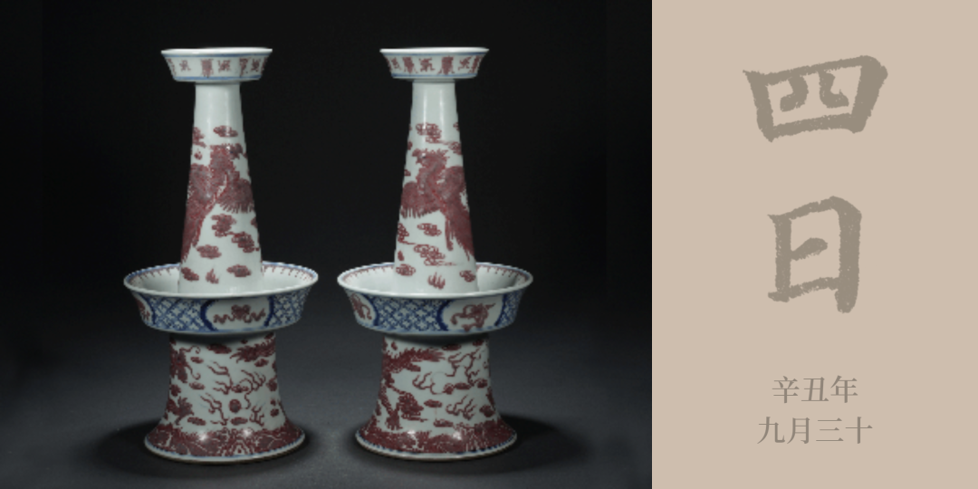 青花釉里红,是将青、红两种釉下彩绘于同一器物上的装饰。此件作品青花典雅高贵,釉里红艳丽活泼,釉面洁白光润。烛台双托盘,台柱上绘龙凤纹样式,造型美观,线条流畅。