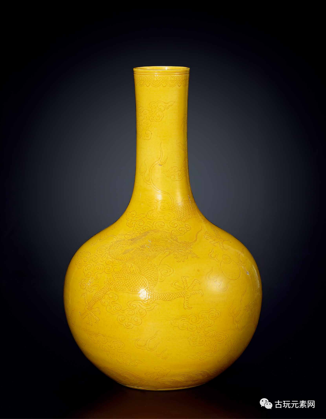 |黄釉暗刻苍龙教子云龙纹天球瓶|